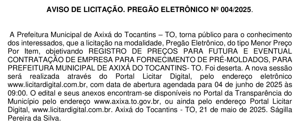 Publicidade Publicidade Geral PREFEITURA DE AXIXÁ DO TO – AVISO DE LICITAÇÃO – PREGÃO ELETRÔNICO Nº 004/2025 By Folha do Bico 22 de maio de 2025 0 97 Share WhatsAppPrintTelegramFacebookTwitterCopy URL Folha do Bico Noticias Relacionadas PREFEITURA DE MAURILÂNDIA DO TO – ATO AVISO DE CONCORRÊNCIA ELETRÔNICA Nº 06/2025 – REPUBLICAÇÃO 2 de dezembro de 2025 PREFEITURA DE MAURILÂNDIA DO TO – ATO AVISO DE CONCORRÊNCIA ELETRÔNICA Nº 05/2025 – REPUBLICAÇÃO 2 de dezembro de 2025 PREFEITURA DE MAURILÂNDIA DO TO – ATO AVISO DE CONCORRÊNCIA ELETRÔNICA Nº 04/2025 – REPUBLICAÇÃO 2 de dezembro de 2025 Share WhatsAppPrintTelegramFacebookTwitterCopy URL Previous articlePREFEITURA DE AXIXÁ DO TO – AVISO DE REPUBLICAÇÃO DE LICITAÇÃONext articlePrefeitos do Bico pressionam bancada federal por emendas e alívio na dívida previdenciária - Advertisement - - Advertisement - Ultimas noticias AUGUSTINÓPOLIS: Vigilante de abrigo é preso suspeito de abusar duas crianças 4 de dezembro de 2025 SÃO MIGUEL: Lixão é fechado e passa a ter acesso controlado sob novas diretrizes ambientais 4 de dezembro de 2025 ARAGUATINS: Insatisfeitos, Abmael, Chico Moura e Rafael Oliveira passam a votar com a oposição e complicam gestão Aquiles 4 de dezembro de 2025 ARAGUATINS: Com voto decisivo e comando da oposição, Airton se torna principal contraponto à gestão Aquiles 4 de dezembro de 2025