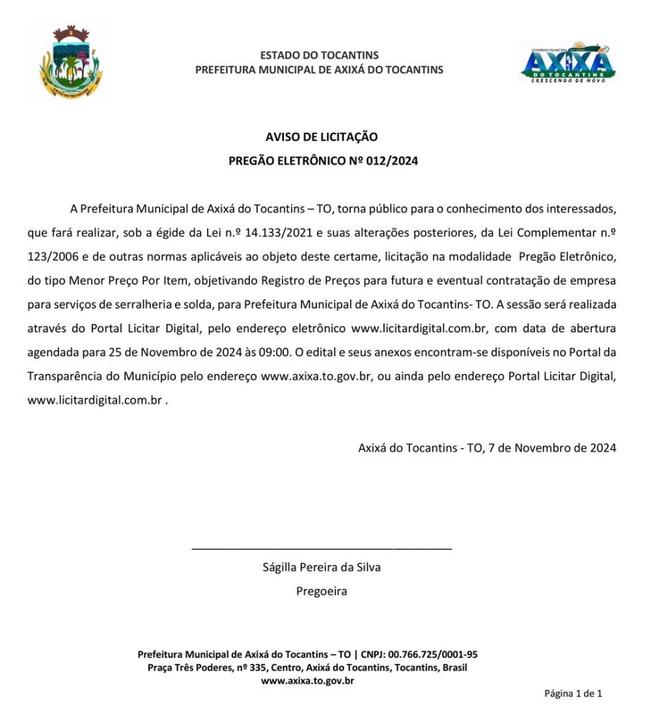 Publicidade Publicidade Geral PREFEITURA DE AXIXÁ DO TO – AVISO DE LICITAÇÃO – PREGÃO ELETRÔNICO Nº 012/2024 By Folha do Bico 8 de novembro de 2024 0 32 Share WhatsAppPrintTelegramFacebookTwitterCopy URL Folha do Bico Noticias Relacionadas PREFEITURA DE MAURILÂNDIA DO TO – ATO AVISO DE CONCORRÊNCIA ELETRÔNICA Nº 06/2025 – REPUBLICAÇÃO 2 de dezembro de 2025 PREFEITURA DE MAURILÂNDIA DO TO – ATO AVISO DE CONCORRÊNCIA ELETRÔNICA Nº 05/2025 – REPUBLICAÇÃO 2 de dezembro de 2025 PREFEITURA DE MAURILÂNDIA DO TO – ATO AVISO DE CONCORRÊNCIA ELETRÔNICA Nº 04/2025 – REPUBLICAÇÃO 2 de dezembro de 2025 Share WhatsAppPrintTelegramFacebookTwitterCopy URL Previous articleConvocação Assembleia Geral PROBICONext articleAUGUSTINÓPOLIS: Procure-se! Jovem suspeito de lavagem de dinheiro internacional é alvo de mandado de prisão - Advertisement - - Advertisement - Ultimas noticias AUGUSTINÓPOLIS: Vigilante de abrigo é preso suspeito de abusar duas crianças 4 de dezembro de 2025 SÃO MIGUEL: Lixão é fechado e passa a ter acesso controlado sob novas diretrizes ambientais 4 de dezembro de 2025 ARAGUATINS: Insatisfeitos, Abmael, Chico Moura e Rafael Oliveira passam a votar com a oposição e complicam gestão Aquiles 4 de dezembro de 2025 ARAGUATINS: Com voto decisivo e comando da oposição, Airton se torna principal contraponto à gestão Aquiles 4 de dezembro de 2025