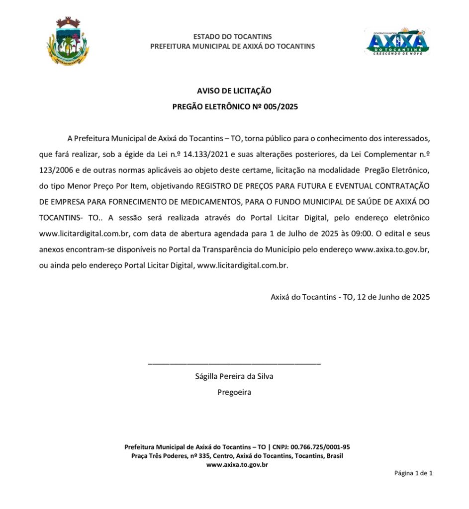 Publicidade Publicidade Geral PREFEITURA DE AXIXÁ DO TO – AVISO DE LICITAÇÃO PREGÃO ELETRÔNICO Nº 05/2025 By Folha do Bico 13 de junho de 2025 0 94 Share WhatsAppPrintTelegramFacebookTwitterCopy URL Folha do Bico Noticias Relacionadas Processo para tirar carteira de motorista fica mais simples, digital e barato em todo o país 9 de dezembro de 2025 Programa Acredita encerra ciclo 2025 com debates sobre crédito, inovação e gestão inteligente 8 de dezembro de 2025 Recorte Automático de Vídeo para uma Edição Multiformato Sem Esforço 5 de dezembro de 2025 Share WhatsAppPrintTelegramFacebookTwitterCopy URL Previous articleITAGUATINS: Município decreta feriado nesta sexta, 13, em homenagem a Santo AntônioNext articlePREFEITURA DE AXIXÁ DO TO – AVISO DE LICITAÇÃO PREGÃO ELETRÔNICO Nº 09/2025 - Advertisement - - Advertisement - Ultimas noticias SÃO MIGUEL: Ordem de serviço autoriza conclusão de creche paralisada há mais de uma década 12 de dezembro de 2025 Policial militar do Tocantins é preso após agressão covarde contra idoso flagrada em vídeo 12 de dezembro de 2025 TOCANTINÓPOLIS: Viatura da Polícia Federal é vista na Prefeitura 12 de dezembro de 2025 No Tocantins, jovem de 20 anos hackeia perfil de professora e pede nudes para alunas de 14 anos 12 de dezembro de 2025