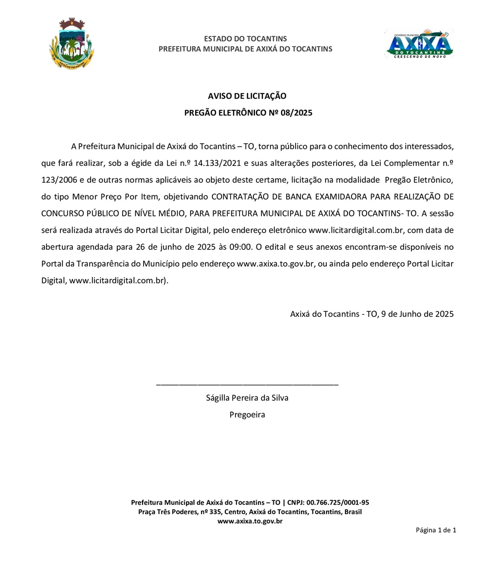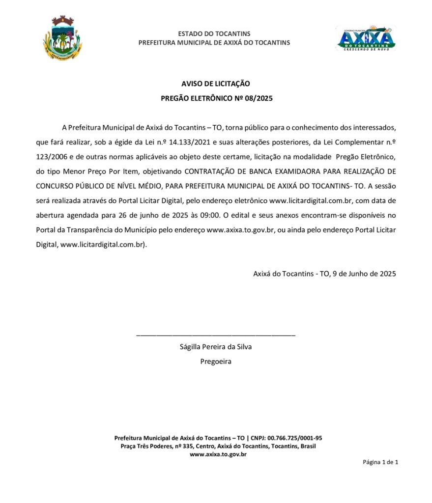 Publicidade Publicidade Geral PREFEITURA DE AXIXÁ DO TO – AVISO DE LICITAÇÃO PREGÃO ELETRÔNICO Nº 08/2025 By Folha do Bico 10 de junho de 2025 0 117 Share WhatsAppPrintTelegramFacebookTwitterCopy URL Folha do Bico Noticias Relacionadas PREFEITURA DE MAURILÂNDIA DO TO – ATO AVISO DE CONCORRÊNCIA ELETRÔNICA Nº 06/2025 – REPUBLICAÇÃO 2 de dezembro de 2025 PREFEITURA DE MAURILÂNDIA DO TO – ATO AVISO DE CONCORRÊNCIA ELETRÔNICA Nº 05/2025 – REPUBLICAÇÃO 2 de dezembro de 2025 PREFEITURA DE MAURILÂNDIA DO TO – ATO AVISO DE CONCORRÊNCIA ELETRÔNICA Nº 04/2025 – REPUBLICAÇÃO 2 de dezembro de 2025 Share WhatsAppPrintTelegramFacebookTwitterCopy URL Previous articlePREFEITURA DE AXIXÁ DO TO – AVISO DE LICITAÇÃO PREGÃO ELETRÔNICO Nº 07/2025Next articleTOCANTINÓPOLIS: Operação desarticula organização criminosa de alcance nacional - Advertisement - - Advertisement - Ultimas noticias AUGUSTINÓPOLIS: Vigilante de abrigo é preso suspeito de abusar duas crianças 4 de dezembro de 2025 SÃO MIGUEL: Lixão é fechado e passa a ter acesso controlado sob novas diretrizes ambientais 4 de dezembro de 2025 ARAGUATINS: Insatisfeitos, Abmael, Chico Moura e Rafael Oliveira passam a votar com a oposição e complicam gestão Aquiles 4 de dezembro de 2025 ARAGUATINS: Com voto decisivo e comando da oposição, Airton se torna principal contraponto à gestão Aquiles 4 de dezembro de 2025
