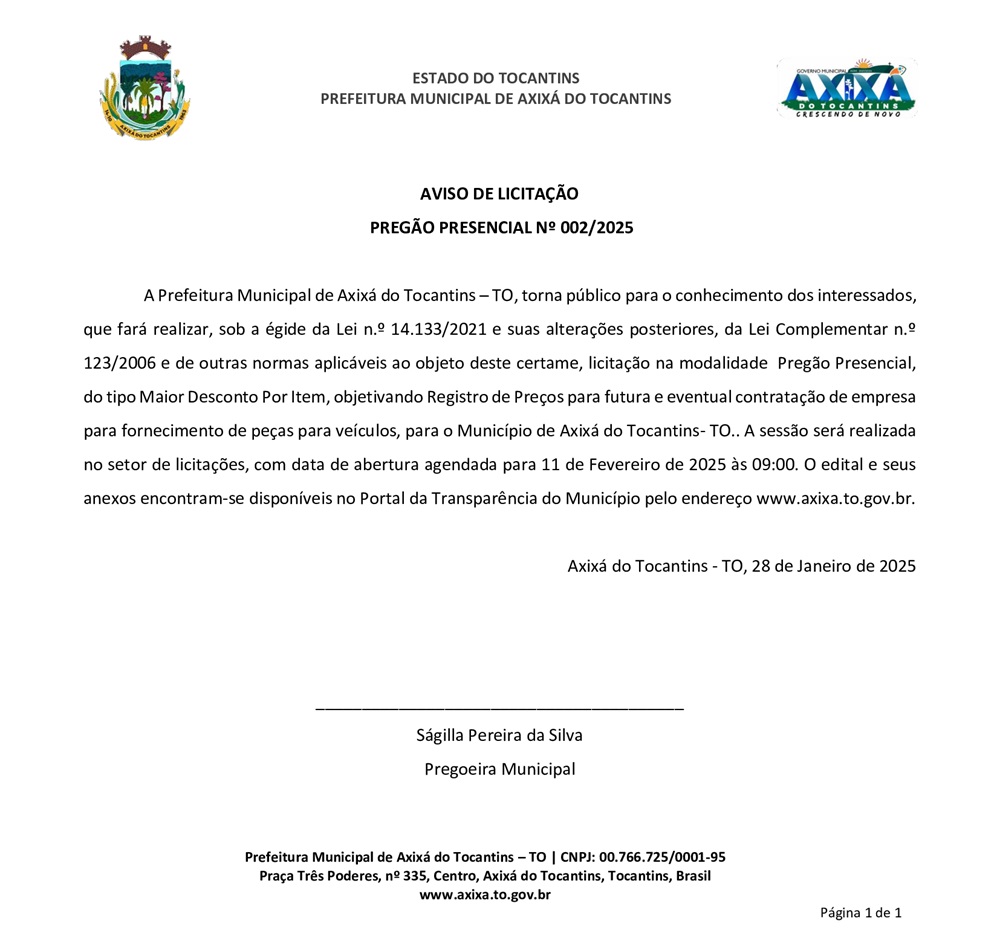 Publicidade Publicidade Geral PREFEITURA DE AXIXÁ DO TO – AVISO DE LICITAÇÃO PREGÃO PRESENCIAL Nº 002/2025 By Folha do Bico 29 de janeiro de 2025 0 40 Share WhatsAppPrintTelegramFacebookTwitterCopy URL Folha do Bico Noticias Relacionadas PREFEITURA DE MAURILÂNDIA DO TO – ATO AVISO DE CONCORRÊNCIA ELETRÔNICA Nº 06/2025 – REPUBLICAÇÃO 2 de dezembro de 2025 PREFEITURA DE MAURILÂNDIA DO TO – ATO AVISO DE CONCORRÊNCIA ELETRÔNICA Nº 05/2025 – REPUBLICAÇÃO 2 de dezembro de 2025 PREFEITURA DE MAURILÂNDIA DO TO – ATO AVISO DE CONCORRÊNCIA ELETRÔNICA Nº 04/2025 – REPUBLICAÇÃO 2 de dezembro de 2025 Share WhatsAppPrintTelegramFacebookTwitterCopy URL Previous articleAGUIARNÓPOLIS: Governo do Tocantins libera benefício eventual para atender famílias em situação de calamidade devido queda da Ponte JKNext articleDeputado Wiston Gomes avalia como produtiva visita ao senador Eduardo Gomes em Brasília - Advertisement - - Advertisement - Ultimas noticias AUGUSTINÓPOLIS: Vigilante de abrigo é preso suspeito de abusar duas crianças 4 de dezembro de 2025 SÃO MIGUEL: Lixão é fechado e passa a ter acesso controlado sob novas diretrizes ambientais 4 de dezembro de 2025 ARAGUATINS: Insatisfeitos, Abmael, Chico Moura e Rafael Oliveira passam a votar com a oposição e complicam gestão Aquiles 4 de dezembro de 2025 ARAGUATINS: Com voto decisivo e comando da oposição, Airton se torna principal contraponto à gestão Aquiles 4 de dezembro de 2025