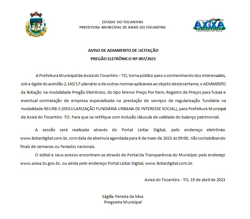 Publicidade Publicidade Geral PREFEITURA DE AXIXÁ DO TOCANTINS – AVISO DE ADIAMENTO DE LICITAÇÃO PREGÃO ELETRÔNICO Nº 007/2023 By Folha do Bico 20 de abril de 2023 0 169 Share WhatsAppPrintTelegramFacebookTwitterCopy URL Folha do Bico Noticias Relacionadas Recorte Automático de Vídeo para uma Edição Multiformato Sem Esforço 5 de dezembro de 2025 PREFEITURA DE MAURILÂNDIA DO TO – ATO AVISO DE CONCORRÊNCIA ELETRÔNICA Nº 06/2025 – REPUBLICAÇÃO 2 de dezembro de 2025 PREFEITURA DE MAURILÂNDIA DO TO – ATO AVISO DE CONCORRÊNCIA ELETRÔNICA Nº 05/2025 – REPUBLICAÇÃO 2 de dezembro de 2025 Share WhatsAppPrintTelegramFacebookTwitterCopy URL Previous articlePrefeitos do Bico querem tirar contratação de PJ’s do limite de gasto com servidoresNext articlePREFEITURA DE AXIXÁ DO TOCANTINS – AVISO DE LICITAÇÃO PREGÃO ELETRÔNICO Nº 010/2023 - Advertisement - - Advertisement - Ultimas noticias Para Nunes Marques, afastamento de Wanderlei era excessivo e violava estabilidade institucional 5 de dezembro de 2025 STF derruba afastamento de Wanderlei Barbosa e governador reassume mandato 5 de dezembro de 2025 “Decisão assertiva”: Ayres destaca respeito ao voto popular na volta de Wanderlei 5 de dezembro de 2025 44 mil famílias sem casa. Enquanto isso, a política do Tocantins segue repetindo promessas que nunca saem do papel 5 de dezembro de 2025