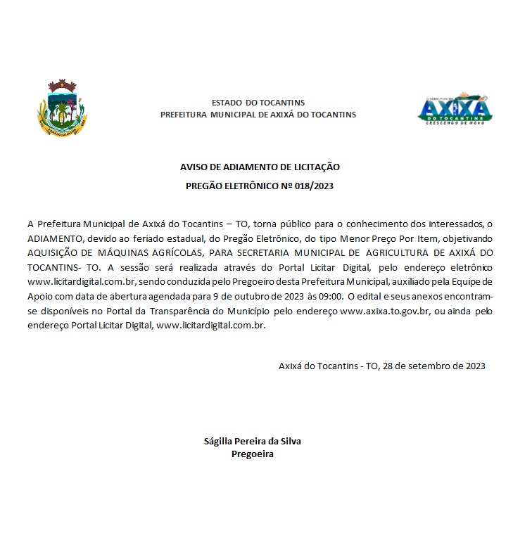 Publicidade Publicidade Geral PREFEITURA DE AXIXÁ DO TOCANTINS – AVISO DE ADIAMENTO DE LICITAÇÃO PREGÃO ELETRÔNICO Nº 018/2023 By Folha do Bico 29 de setembro de 2023 0 81 Share WhatsAppPrintTelegramFacebookTwitterCopy URL Folha do Bico Noticias Relacionadas Recorte Automático de Vídeo para uma Edição Multiformato Sem Esforço 5 de dezembro de 2025 PREFEITURA DE MAURILÂNDIA DO TO – ATO AVISO DE CONCORRÊNCIA ELETRÔNICA Nº 06/2025 – REPUBLICAÇÃO 2 de dezembro de 2025 PREFEITURA DE MAURILÂNDIA DO TO – ATO AVISO DE CONCORRÊNCIA ELETRÔNICA Nº 05/2025 – REPUBLICAÇÃO 2 de dezembro de 2025 Share WhatsAppPrintTelegramFacebookTwitterCopy URL Previous articleAUGUSTINÓPOLIS: Homenagem a Antônio do Bar na ALETO, destaca seu papel na evolução dos 35 anos do TocantinsNext articleANGICO: Idoso investigado por homicídio é preso com arsenal em fazenda - Advertisement - - Advertisement - Ultimas noticias Para Nunes Marques, afastamento de Wanderlei era excessivo e violava estabilidade institucional 5 de dezembro de 2025 STF derruba afastamento de Wanderlei Barbosa e governador reassume mandato 5 de dezembro de 2025 AUGUSTINÓPOLIS: Acender das Luzes celebra 4ª edição da Magia do Natal com espetáculo especial nesta sexta-feira 5 de dezembro de 2025 44 mil famílias sem casa. Enquanto isso, a política do Tocantins segue repetindo promessas que nunca saem do papel 5 de dezembro de 2025