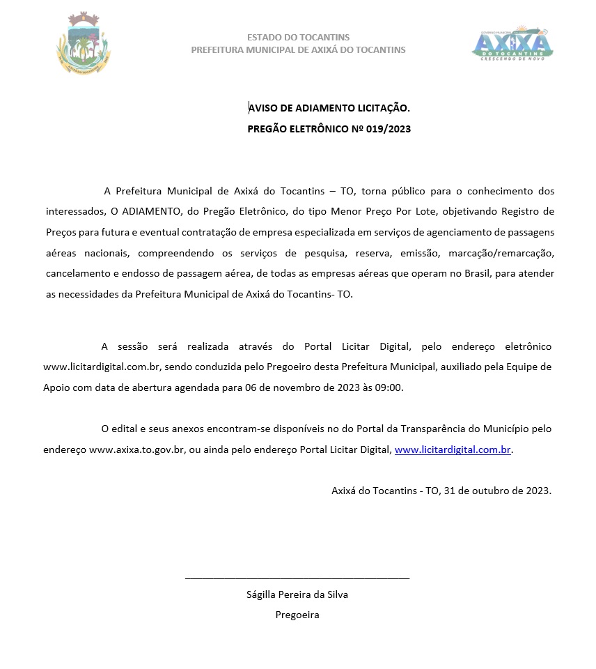 Publicidade Publicidade Geral PREFEITURA DE AXIXÁ DO TOCANTINS – AVISO DE ADIAMENTO LICITAÇÃO. PREGÃO ELETRÔNICO Nº 019/2023 By Folha do Bico 1 de novembro de 2023 0 61 Share WhatsAppPrintTelegramFacebookTwitterCopy URL Folha do Bico Noticias Relacionadas Recorte Automático de Vídeo para uma Edição Multiformato Sem Esforço 5 de dezembro de 2025 PREFEITURA DE MAURILÂNDIA DO TO – ATO AVISO DE CONCORRÊNCIA ELETRÔNICA Nº 06/2025 – REPUBLICAÇÃO 2 de dezembro de 2025 PREFEITURA DE MAURILÂNDIA DO TO – ATO AVISO DE CONCORRÊNCIA ELETRÔNICA Nº 05/2025 – REPUBLICAÇÃO 2 de dezembro de 2025 Share WhatsAppPrintTelegramFacebookTwitterCopy URL Previous articleAcidente grave na TO-201 nesta terça-feira no Bico do PapagaioNext articleARAGUATINS: Wiston é o nome menos rejeitado e com melhor chance de vencer Aquiles - Advertisement - - Advertisement - Ultimas noticias Para Nunes Marques, afastamento de Wanderlei era excessivo e violava estabilidade institucional 5 de dezembro de 2025 STF derruba afastamento de Wanderlei Barbosa e governador reassume mandato 5 de dezembro de 2025 AUGUSTINÓPOLIS: Acender das Luzes celebra 4ª edição da Magia do Natal com espetáculo especial nesta sexta-feira 5 de dezembro de 2025 44 mil famílias sem casa. Enquanto isso, a política do Tocantins segue repetindo promessas que nunca saem do papel 5 de dezembro de 2025