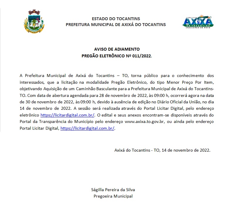Publicidade Publicidade Geral PREFEITURA DE AXIXÁ DO TOCANTINS – AVISO DE ADIAMENTO PREGÃO ELETRÔNICO ELETRÔNICO Nº 011/2022 By Folha do Bico 15 de novembro de 2022 0 141 Share WhatsAppPrintTelegramFacebookTwitterCopy URL Folha do Bico Noticias Relacionadas Recorte Automático de Vídeo para uma Edição Multiformato Sem Esforço 5 de dezembro de 2025 PREFEITURA DE MAURILÂNDIA DO TO – ATO AVISO DE CONCORRÊNCIA ELETRÔNICA Nº 06/2025 – REPUBLICAÇÃO 2 de dezembro de 2025 PREFEITURA DE MAURILÂNDIA DO TO – ATO AVISO DE CONCORRÊNCIA ELETRÔNICA Nº 05/2025 – REPUBLICAÇÃO 2 de dezembro de 2025 Share WhatsAppPrintTelegramFacebookTwitterCopy URL Previous articleMAURILÂNDIA: Ladrão furta dinheiro e objetos em bar no centro da cidadeNext articlePrimeiro dia de provas do ENEM no Bico foi tranquilo - Advertisement - - Advertisement - Ultimas noticias Para Nunes Marques, afastamento de Wanderlei era excessivo e violava estabilidade institucional 5 de dezembro de 2025 STF derruba afastamento de Wanderlei Barbosa e governador reassume mandato 5 de dezembro de 2025 “Decisão assertiva”: Ayres destaca respeito ao voto popular na volta de Wanderlei 5 de dezembro de 2025 44 mil famílias sem casa. Enquanto isso, a política do Tocantins segue repetindo promessas que nunca saem do papel 5 de dezembro de 2025