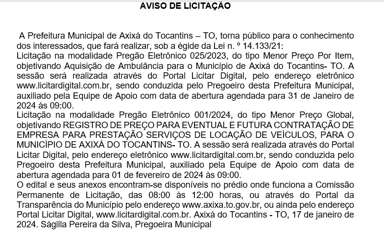 Publicidade Publicidade Geral PREFEITURA DE AXIXÁ DO TOCANTINS- AVISO DE LICITAÇÃO By Folha do Bico 18 de janeiro de 2024 0 118 Share WhatsAppPrintTelegramFacebookTwitterCopy URL Folha do Bico Noticias Relacionadas Recorte Automático de Vídeo para uma Edição Multiformato Sem Esforço 5 de dezembro de 2025 PREFEITURA DE MAURILÂNDIA DO TO – ATO AVISO DE CONCORRÊNCIA ELETRÔNICA Nº 06/2025 – REPUBLICAÇÃO 2 de dezembro de 2025 PREFEITURA DE MAURILÂNDIA DO TO – ATO AVISO DE CONCORRÊNCIA ELETRÔNICA Nº 05/2025 – REPUBLICAÇÃO 2 de dezembro de 2025 Share WhatsAppPrintTelegramFacebookTwitterCopy URL Previous articleBURITI: Estádio Municipal Pedro Amorim receberá obra de revitalização e iluminaçãoNext articleGoverno do Estado atualiza regras para uso de gás canalizado no Pará - Advertisement - - Advertisement - Ultimas noticias Para Nunes Marques, afastamento de Wanderlei era excessivo e violava estabilidade institucional 5 de dezembro de 2025 STF derruba afastamento de Wanderlei Barbosa e governador reassume mandato 5 de dezembro de 2025 AUGUSTINÓPOLIS: Acender das Luzes celebra 4ª edição da Magia do Natal com espetáculo especial nesta sexta-feira 5 de dezembro de 2025 44 mil famílias sem casa. Enquanto isso, a política do Tocantins segue repetindo promessas que nunca saem do papel 5 de dezembro de 2025
