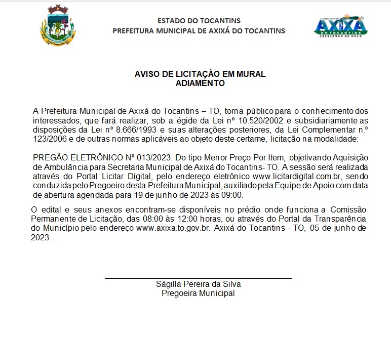 Publicidade Publicidade Geral PREFEITURA DE AXIXÁ DO TOCANTINS – AVISO DE LICITAÇÃO EM MURAL ADIAMENTO By Folha do Bico 6 de junho de 2023 0 142 Share WhatsAppPrintTelegramFacebookTwitterCopy URL Folha do Bico Noticias Relacionadas Recorte Automático de Vídeo para uma Edição Multiformato Sem Esforço 5 de dezembro de 2025 PREFEITURA DE MAURILÂNDIA DO TO – ATO AVISO DE CONCORRÊNCIA ELETRÔNICA Nº 06/2025 – REPUBLICAÇÃO 2 de dezembro de 2025 PREFEITURA DE MAURILÂNDIA DO TO – ATO AVISO DE CONCORRÊNCIA ELETRÔNICA Nº 05/2025 – REPUBLICAÇÃO 2 de dezembro de 2025 Share WhatsAppPrintTelegramFacebookTwitterCopy URL Previous articleARAGUATINS: Confira a programação completa da comemoração dos 155 anos de história do municípioNext articleARAGUATINS: Veja as vagas de emprego no SINE para esta terça, 6 - Advertisement - - Advertisement - Ultimas noticias Para Nunes Marques, afastamento de Wanderlei era excessivo e violava estabilidade institucional 5 de dezembro de 2025 STF derruba afastamento de Wanderlei Barbosa e governador reassume mandato 5 de dezembro de 2025 “Decisão assertiva”: Ayres destaca respeito ao voto popular na volta de Wanderlei 5 de dezembro de 2025 44 mil famílias sem casa. Enquanto isso, a política do Tocantins segue repetindo promessas que nunca saem do papel 5 de dezembro de 2025