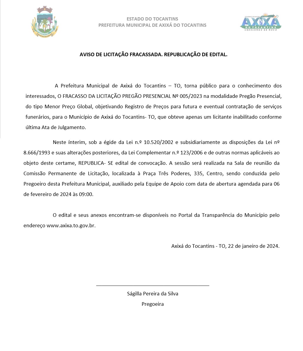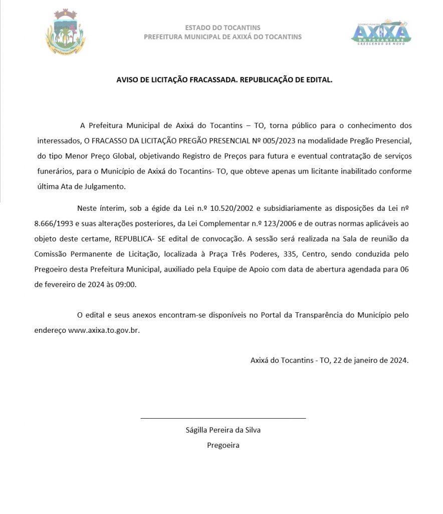 Publicidade Publicidade Geral PREFEITURA DE AXIXÁ DO TOCANTINS – AVISO DE LICITAÇÃO FRACASSADA. REPUBLICAÇÃO DE EDITAL By Folha do Bico 23 de janeiro de 2024 0 116 Share WhatsAppPrintTelegramFacebookTwitterCopy URL Folha do Bico Noticias Relacionadas Recorte Automático de Vídeo para uma Edição Multiformato Sem Esforço 5 de dezembro de 2025 PREFEITURA DE MAURILÂNDIA DO TO – ATO AVISO DE CONCORRÊNCIA ELETRÔNICA Nº 06/2025 – REPUBLICAÇÃO 2 de dezembro de 2025 PREFEITURA DE MAURILÂNDIA DO TO – ATO AVISO DE CONCORRÊNCIA ELETRÔNICA Nº 05/2025 – REPUBLICAÇÃO 2 de dezembro de 2025 Share WhatsAppPrintTelegramFacebookTwitterCopy URL Previous articleTOCANTINÓPOLIS: Cokim cutuca pré-candidaturas de Salomão e Alaor. “O povo não será enganado”Next articleVeículo com restrições judiciais leva à prisão de homem por documento falso no Bico do Papagaio - Advertisement - - Advertisement - Ultimas noticias Para Nunes Marques, afastamento de Wanderlei era excessivo e violava estabilidade institucional 5 de dezembro de 2025 STF derruba afastamento de Wanderlei Barbosa e governador reassume mandato 5 de dezembro de 2025 AUGUSTINÓPOLIS: Acender das Luzes celebra 4ª edição da Magia do Natal com espetáculo especial nesta sexta-feira 5 de dezembro de 2025 44 mil famílias sem casa. Enquanto isso, a política do Tocantins segue repetindo promessas que nunca saem do papel 5 de dezembro de 2025