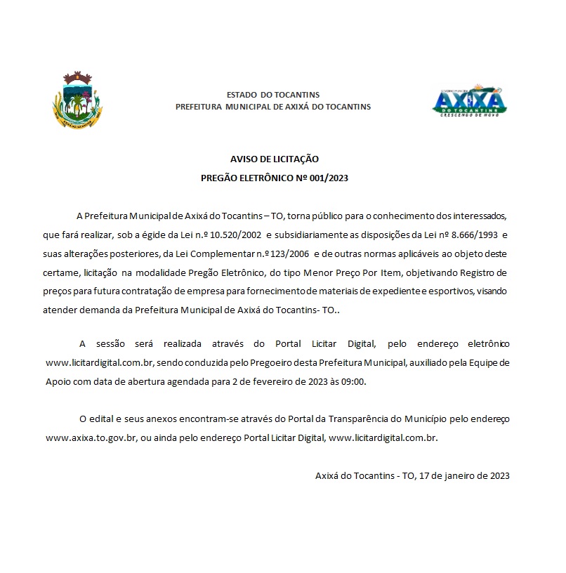 Publicidade Publicidade Geral PREFEITURA DE AXIXÁ DO TOCANTINS – AVISO DE LICITAÇÃO PREGÃO ELETRÔNICO Nº 001/2023 By Folha do Bico 20 de janeiro de 2023 0 273 Share WhatsAppPrintTelegramFacebookTwitterCopy URL Folha do Bico Noticias Relacionadas Recorte Automático de Vídeo para uma Edição Multiformato Sem Esforço 5 de dezembro de 2025 PREFEITURA DE MAURILÂNDIA DO TO – ATO AVISO DE CONCORRÊNCIA ELETRÔNICA Nº 06/2025 – REPUBLICAÇÃO 2 de dezembro de 2025 PREFEITURA DE MAURILÂNDIA DO TO – ATO AVISO DE CONCORRÊNCIA ELETRÔNICA Nº 05/2025 – REPUBLICAÇÃO 2 de dezembro de 2025 Share WhatsAppPrintTelegramFacebookTwitterCopy URL Previous articleTOCANTINÓPOLIS: Verdão do Bico vai ao Pará e fica no empate em amistoso com ItupirangaNext articleARAGUATINS: Veja as vagas de emprego no SINE para esta sexta, 20 - Advertisement - - Advertisement - Ultimas noticias Para Nunes Marques, afastamento de Wanderlei era excessivo e violava estabilidade institucional 5 de dezembro de 2025 STF derruba afastamento de Wanderlei Barbosa e governador reassume mandato 5 de dezembro de 2025 “Decisão assertiva”: Ayres destaca respeito ao voto popular na volta de Wanderlei 5 de dezembro de 2025 44 mil famílias sem casa. Enquanto isso, a política do Tocantins segue repetindo promessas que nunca saem do papel 5 de dezembro de 2025