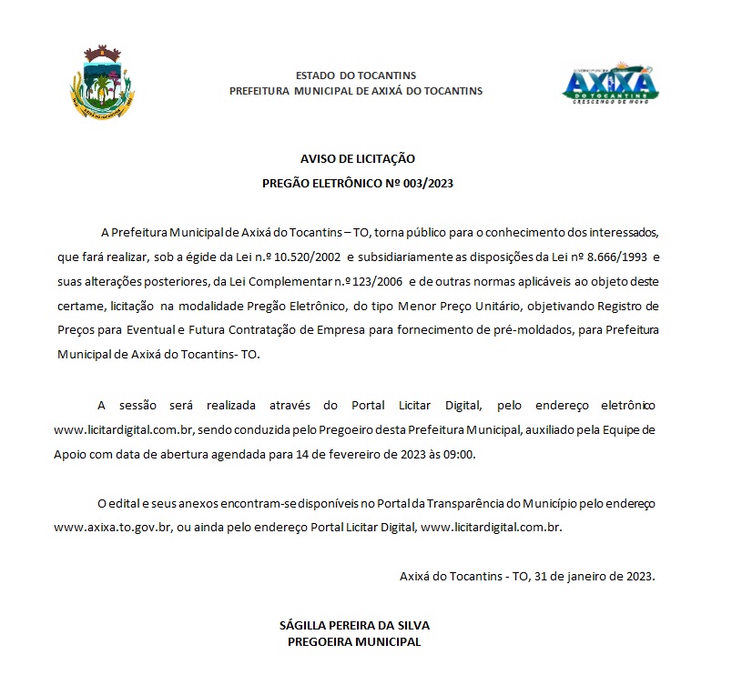 Publicidade Publicidade Geral PREFEITURA DE AXIXÁ DO TOCANTINS – AVISO DE LICITAÇÃO PREGÃO ELETRÔNICO Nº 003/2023 By Folha do Bico 1 de fevereiro de 2023 0 145 Share WhatsAppPrintTelegramFacebookTwitterCopy URL Folha do Bico Noticias Relacionadas Recorte Automático de Vídeo para uma Edição Multiformato Sem Esforço 5 de dezembro de 2025 PREFEITURA DE MAURILÂNDIA DO TO – ATO AVISO DE CONCORRÊNCIA ELETRÔNICA Nº 06/2025 – REPUBLICAÇÃO 2 de dezembro de 2025 PREFEITURA DE MAURILÂNDIA DO TO – ATO AVISO DE CONCORRÊNCIA ELETRÔNICA Nº 05/2025 – REPUBLICAÇÃO 2 de dezembro de 2025 Share WhatsAppPrintTelegramFacebookTwitterCopy URL Previous articleSaiba sobre os 24 deputados estaduais que tomam posse nesta quarta, 1ºNext articleARAGUATINS: Veja as vagas de emprego no SINE para esta quarta, 1º - Advertisement - - Advertisement - Ultimas noticias Para Nunes Marques, afastamento de Wanderlei era excessivo e violava estabilidade institucional 5 de dezembro de 2025 STF derruba afastamento de Wanderlei Barbosa e governador reassume mandato 5 de dezembro de 2025 “Decisão assertiva”: Ayres destaca respeito ao voto popular na volta de Wanderlei 5 de dezembro de 2025 44 mil famílias sem casa. Enquanto isso, a política do Tocantins segue repetindo promessas que nunca saem do papel 5 de dezembro de 2025