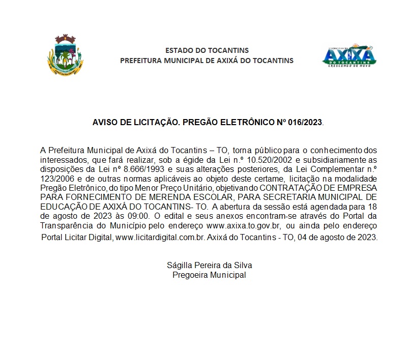 Publicidade Publicidade Geral PREFEITURA DE AXIXÁ DO TOCANTINS – AVISO DE LICITAÇÃO. PREGÃO ELETRÔNICO Nº 016/2023. By Folha do Bico 7 de agosto de 2023 0 107 Share FacebookTwitterPinterestWhatsApp Folha do Bico Noticias Relacionadas De mineira anônima a fenômeno digital: o impacto do título de Kerolay Chaves 13 de novembro de 2025 Antecipar o FGTS antes de novembro impacta na nova regra? Descubra 24 de outubro de 2025 True Crime: quais os melhores documentários grátis do gênero? 20 de outubro de 2025 Share FacebookTwitterPinterestWhatsApp Previous articleARAGUATINS: Lavrador morre eletrocutado em chácaraNext articleARAGUATINS: Veja as vagas de emprego no SINE para esta segunda, 7 - Advertisement - - Advertisement - Ultimas noticias XAMBIOÁ: Após ser chamado de “sem vergonha” por Mayck, Gaguim reage e dispara contra prefeito, “Você traiu a sua esposa” 15 de novembro de 2025 XAMBIOÁ: Prefeito Mayck chama deputado Gaguim de “sem vergonha” e denuncia retirada de obras 15 de novembro de 2025 TOCANTINÓPOLIS: Falso advogado atendia clientes e anunciava serviços nas redes sociais 15 de novembro de 2025 Impasse jurídico de Wanderlei Barbosa coloca Eduardo Gomes em compasso de espera 15 de novembro de 2025