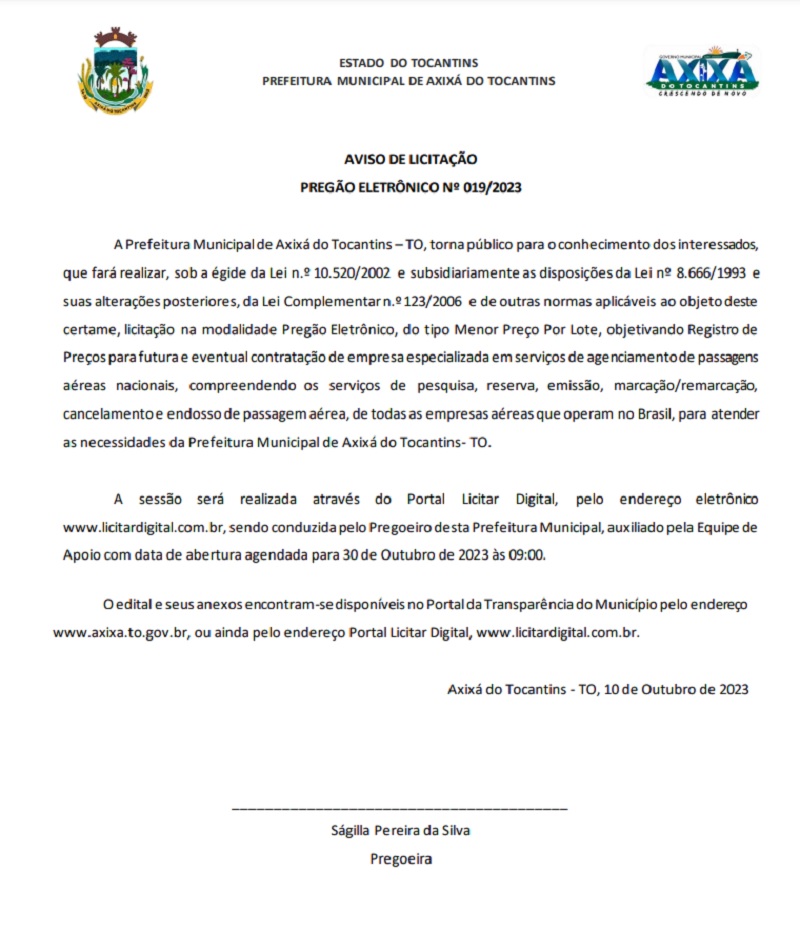 Publicidade Publicidade Geral PREFEITURA DE AXIXÁ DO TOCANTINS – AVISO DE LICITAÇÃO PREGÃO ELETRÔNICO Nº 019/2023 By Folha do Bico 11 de outubro de 2023 0 57 Share WhatsAppPrintTelegramFacebookTwitterCopy URL Folha do Bico Noticias Relacionadas Recorte Automático de Vídeo para uma Edição Multiformato Sem Esforço 5 de dezembro de 2025 PREFEITURA DE MAURILÂNDIA DO TO – ATO AVISO DE CONCORRÊNCIA ELETRÔNICA Nº 06/2025 – REPUBLICAÇÃO 2 de dezembro de 2025 PREFEITURA DE MAURILÂNDIA DO TO – ATO AVISO DE CONCORRÊNCIA ELETRÔNICA Nº 05/2025 – REPUBLICAÇÃO 2 de dezembro de 2025 Share WhatsAppPrintTelegramFacebookTwitterCopy URL Previous articlePARAUAPEBAS: Chico das Cortinas diz que será candidato a vereadorNext articleARAGUATINS: Veja as vagas de emprego no SINE para esta quarta, 11 - Advertisement - - Advertisement - Ultimas noticias Para Nunes Marques, afastamento de Wanderlei era excessivo e violava estabilidade institucional 5 de dezembro de 2025 STF derruba afastamento de Wanderlei Barbosa e governador reassume mandato 5 de dezembro de 2025 AUGUSTINÓPOLIS: Acender das Luzes celebra 4ª edição da Magia do Natal com espetáculo especial nesta sexta-feira 5 de dezembro de 2025 44 mil famílias sem casa. Enquanto isso, a política do Tocantins segue repetindo promessas que nunca saem do papel 5 de dezembro de 2025