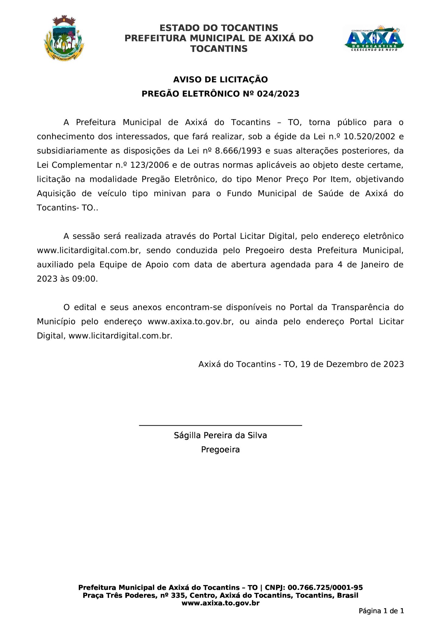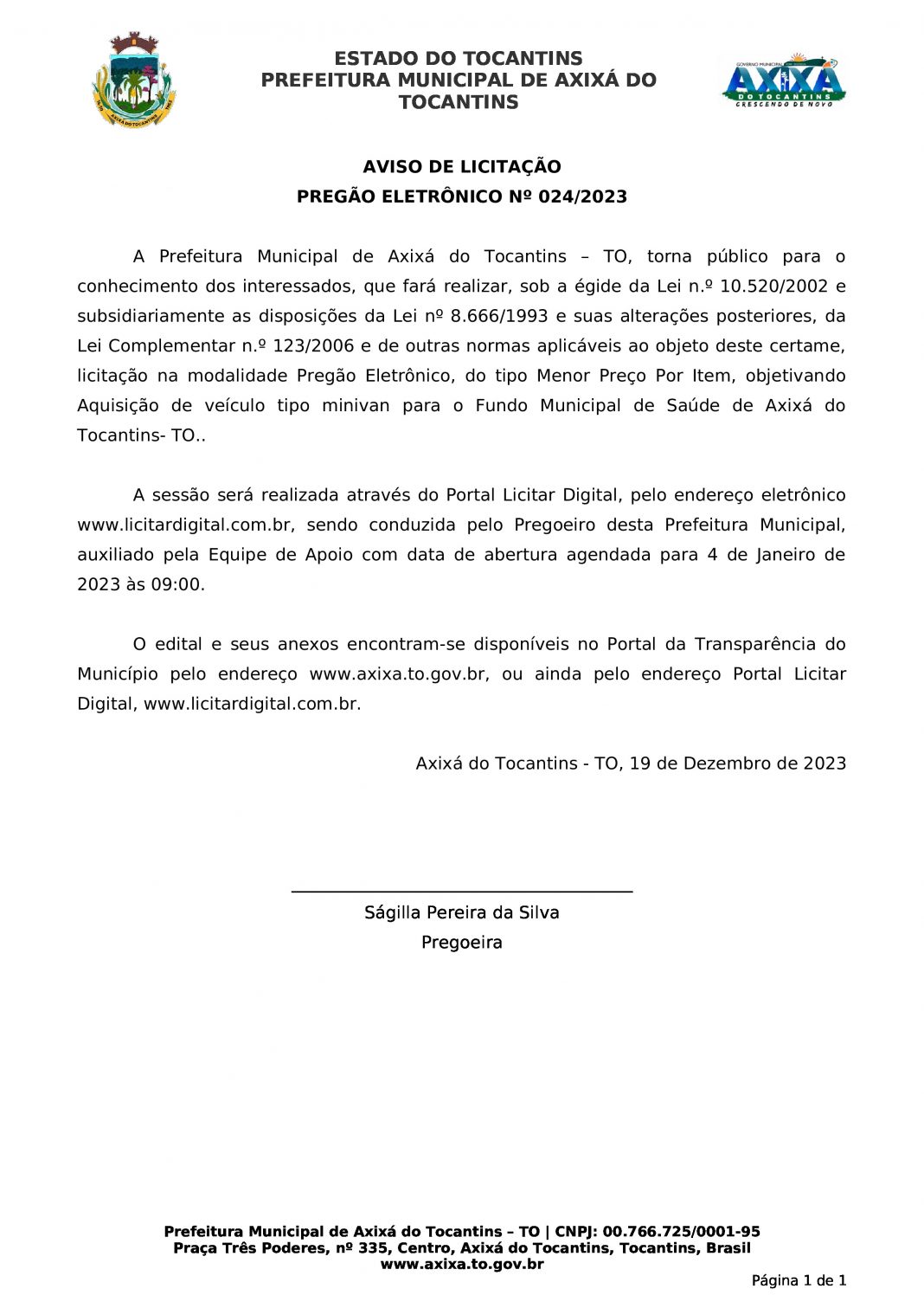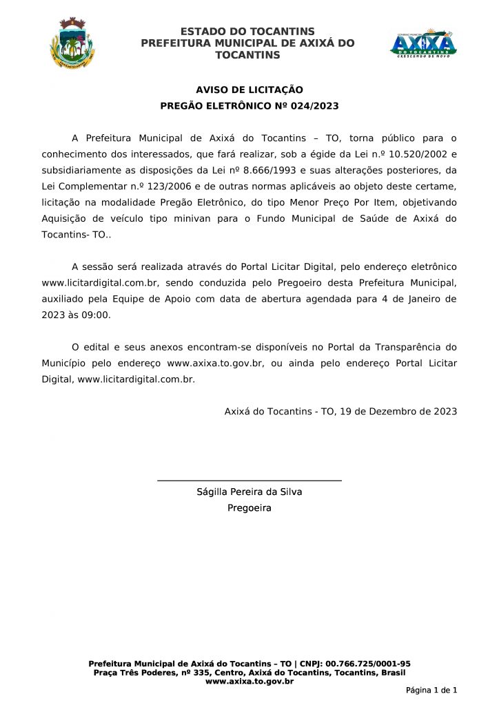 Publicidade Publicidade Geral PREFEITURA DE AXIXÁ DO TOCANTINS – AVISO DE LICITAÇÃO PREGÃO ELETRÔNICO Nº 024/2023 By Folha do Bico 20 de dezembro de 2023 0 93 Share WhatsAppPrintTelegramFacebookTwitterCopy URL Folha do Bico Noticias Relacionadas Recorte Automático de Vídeo para uma Edição Multiformato Sem Esforço 5 de dezembro de 2025 PREFEITURA DE MAURILÂNDIA DO TO – ATO AVISO DE CONCORRÊNCIA ELETRÔNICA Nº 06/2025 – REPUBLICAÇÃO 2 de dezembro de 2025 PREFEITURA DE MAURILÂNDIA DO TO – ATO AVISO DE CONCORRÊNCIA ELETRÔNICA Nº 05/2025 – REPUBLICAÇÃO 2 de dezembro de 2025 Share WhatsAppPrintTelegramFacebookTwitterCopy URL Previous articleARAGUATINS: Pacientes de hemodiálise continuam sofrendo descaso da Saúde com falhas no transporte e assistência inadequadaNext articlePREFEITURA DE AXIXÁ DO TOCANTINS – AVISO DE LICITAÇÃO PREGÃO PRESENCIAL Nº 005/2023 - Advertisement - - Advertisement - Ultimas noticias Para Nunes Marques, afastamento de Wanderlei era excessivo e violava estabilidade institucional 5 de dezembro de 2025 STF derruba afastamento de Wanderlei Barbosa e governador reassume mandato 5 de dezembro de 2025 AUGUSTINÓPOLIS: Acender das Luzes celebra 4ª edição da Magia do Natal com espetáculo especial nesta sexta-feira 5 de dezembro de 2025 44 mil famílias sem casa. Enquanto isso, a política do Tocantins segue repetindo promessas que nunca saem do papel 5 de dezembro de 2025