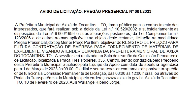 Publicidade Publicidade Geral PREFEITURA DE AXIXÁ DO TOCANTINS – AVISO DE LICITAÇÃO. PREGÃO PRESENCIAL Nº 001/2023 By Folha do Bico 10 de fevereiro de 2023 0 155 Share WhatsAppPrintTelegramFacebookTwitterCopy URL Folha do Bico Noticias Relacionadas Recorte Automático de Vídeo para uma Edição Multiformato Sem Esforço 5 de dezembro de 2025 PREFEITURA DE MAURILÂNDIA DO TO – ATO AVISO DE CONCORRÊNCIA ELETRÔNICA Nº 06/2025 – REPUBLICAÇÃO 2 de dezembro de 2025 PREFEITURA DE MAURILÂNDIA DO TO – ATO AVISO DE CONCORRÊNCIA ELETRÔNICA Nº 05/2025 – REPUBLICAÇÃO 2 de dezembro de 2025 Share WhatsAppPrintTelegramFacebookTwitterCopy URL Previous articleWanderlei nomeia mais 6 secretários, 4 presidentes de autarquias e 14 secretários executivosNext articleAUGUSTINÓPOLIS: PM prende duas pessoas suspeitas de envolvimento com o tráfico de drogas - Advertisement - - Advertisement - Ultimas noticias Para Nunes Marques, afastamento de Wanderlei era excessivo e violava estabilidade institucional 5 de dezembro de 2025 STF derruba afastamento de Wanderlei Barbosa e governador reassume mandato 5 de dezembro de 2025 “Decisão assertiva”: Ayres destaca respeito ao voto popular na volta de Wanderlei 5 de dezembro de 2025 44 mil famílias sem casa. Enquanto isso, a política do Tocantins segue repetindo promessas que nunca saem do papel 5 de dezembro de 2025
