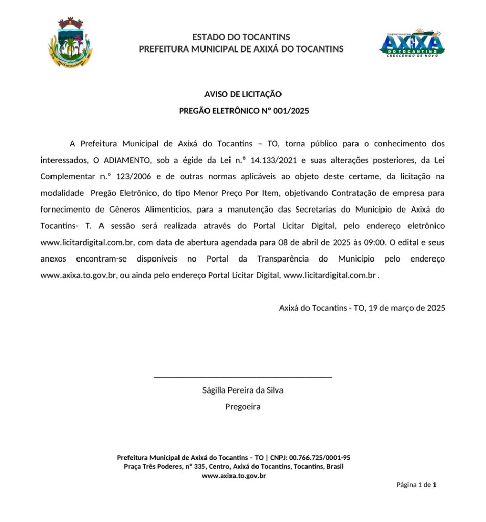 Publicidade Publicidade Geral PREFEITURA DE AXIXÁ-TO – AVISO DE LICITAÇÃO PREGÃO ELETRÔNICO Nº 001/2025 By Folha do Bico 19 de março de 2025 0 30 Share WhatsAppPrintTelegramFacebookTwitterCopy URL Folha do Bico Noticias Relacionadas PREFEITURA DE MAURILÂNDIA DO TO – ATO AVISO DE CONCORRÊNCIA ELETRÔNICA Nº 06/2025 – REPUBLICAÇÃO 2 de dezembro de 2025 PREFEITURA DE MAURILÂNDIA DO TO – ATO AVISO DE CONCORRÊNCIA ELETRÔNICA Nº 05/2025 – REPUBLICAÇÃO 2 de dezembro de 2025 PREFEITURA DE MAURILÂNDIA DO TO – ATO AVISO DE CONCORRÊNCIA ELETRÔNICA Nº 04/2025 – REPUBLICAÇÃO 2 de dezembro de 2025 Share WhatsAppPrintTelegramFacebookTwitterCopy URL Previous articleCapital FC vence Araguaína FR no primeiro jogo da semifinal e leva vantagem para a voltaNext articlePREFEITURA DE AXIXÁ-TO – AVISO DE LICITAÇÃO PREGÃO ELETRÔNICO Nº 002/2025 - Advertisement - - Advertisement - Ultimas noticias AUGUSTINÓPOLIS: Vigilante de abrigo é preso suspeito de abusar duas crianças 4 de dezembro de 2025 SÃO MIGUEL: Lixão é fechado e passa a ter acesso controlado sob novas diretrizes ambientais 4 de dezembro de 2025 ARAGUATINS: Insatisfeitos, Abmael, Chico Moura e Rafael Oliveira passam a votar com a oposição e complicam gestão Aquiles 4 de dezembro de 2025 ARAGUATINS: Com voto decisivo e comando da oposição, Airton se torna principal contraponto à gestão Aquiles 4 de dezembro de 2025
