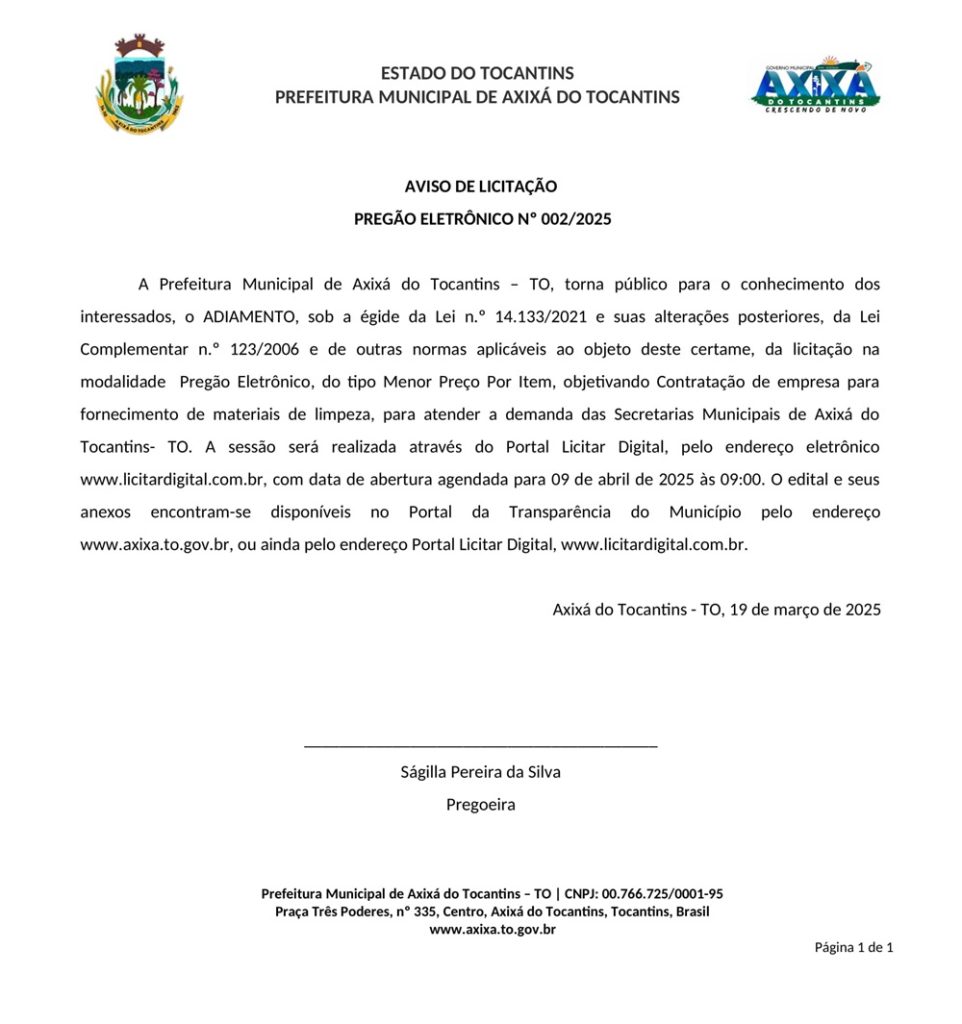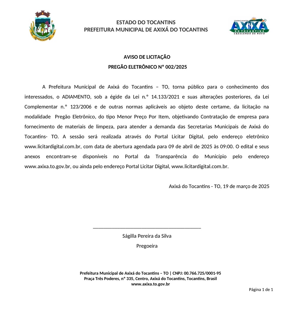 Publicidade Publicidade Geral PREFEITURA DE AXIXÁ-TO – AVISO DE LICITAÇÃO PREGÃO ELETRÔNICO Nº 002/2025 By Folha do Bico 19 de março de 2025 0 45 Share WhatsAppPrintTelegramFacebookTwitterCopy URL Folha do Bico Noticias Relacionadas PREFEITURA DE MAURILÂNDIA DO TO – ATO AVISO DE CONCORRÊNCIA ELETRÔNICA Nº 06/2025 – REPUBLICAÇÃO 2 de dezembro de 2025 PREFEITURA DE MAURILÂNDIA DO TO – ATO AVISO DE CONCORRÊNCIA ELETRÔNICA Nº 05/2025 – REPUBLICAÇÃO 2 de dezembro de 2025 PREFEITURA DE MAURILÂNDIA DO TO – ATO AVISO DE CONCORRÊNCIA ELETRÔNICA Nº 04/2025 – REPUBLICAÇÃO 2 de dezembro de 2025 Share WhatsAppPrintTelegramFacebookTwitterCopy URL Previous articlePREFEITURA DE AXIXÁ-TO – AVISO DE LICITAÇÃO PREGÃO ELETRÔNICO Nº 001/2025Next articleTJD-TO julgará nesta quinta, 20, ação sobre possível escalação irregular de jogador do União - Advertisement - - Advertisement - Ultimas noticias AUGUSTINÓPOLIS: Vigilante de abrigo é preso suspeito de abusar duas crianças 4 de dezembro de 2025 SÃO MIGUEL: Lixão é fechado e passa a ter acesso controlado sob novas diretrizes ambientais 4 de dezembro de 2025 ARAGUATINS: Insatisfeitos, Abmael, Chico Moura e Rafael Oliveira passam a votar com a oposição e complicam gestão Aquiles 4 de dezembro de 2025 ARAGUATINS: Com voto decisivo e comando da oposição, Airton se torna principal contraponto à gestão Aquiles 4 de dezembro de 2025