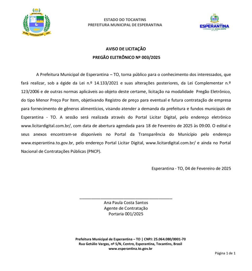 Publicidade Publicidade Geral PREFEITURA DE ESPERANTINA-TO – AVISO DE LICITAÇÃO – PREGÃO ELETRÔNICO Nº 003/2025 By Folha do Bico 5 de fevereiro de 2025 0 38 Share WhatsAppPrintTelegramFacebookTwitterCopy URL Folha do Bico Noticias Relacionadas PREFEITURA DE MAURILÂNDIA DO TO – ATO AVISO DE CONCORRÊNCIA ELETRÔNICA Nº 06/2025 – REPUBLICAÇÃO 2 de dezembro de 2025 PREFEITURA DE MAURILÂNDIA DO TO – ATO AVISO DE CONCORRÊNCIA ELETRÔNICA Nº 05/2025 – REPUBLICAÇÃO 2 de dezembro de 2025 PREFEITURA DE MAURILÂNDIA DO TO – ATO AVISO DE CONCORRÊNCIA ELETRÔNICA Nº 04/2025 – REPUBLICAÇÃO 2 de dezembro de 2025 Share WhatsAppPrintTelegramFacebookTwitterCopy URL Previous articlePRAIA NORTE: Município garante 75 casas populares por meio do Minha Casa Minha VidaNext articlePREFEITURA DE ESPERANTINA-TO – AVISO DE LICITAÇÃO – PREGÃO ELETRÔNICO Nº 004/2025 - Advertisement - - Advertisement - Ultimas noticias AUGUSTINÓPOLIS: Vigilante de abrigo é preso suspeito de abusar duas crianças 4 de dezembro de 2025 SÃO MIGUEL: Lixão é fechado e passa a ter acesso controlado sob novas diretrizes ambientais 4 de dezembro de 2025 ARAGUATINS: Insatisfeitos, Abmael, Chico Moura e Rafael Oliveira passam a votar com a oposição e complicam gestão Aquiles 4 de dezembro de 2025 ARAGUATINS: Com voto decisivo e comando da oposição, Airton se torna principal contraponto à gestão Aquiles 4 de dezembro de 2025