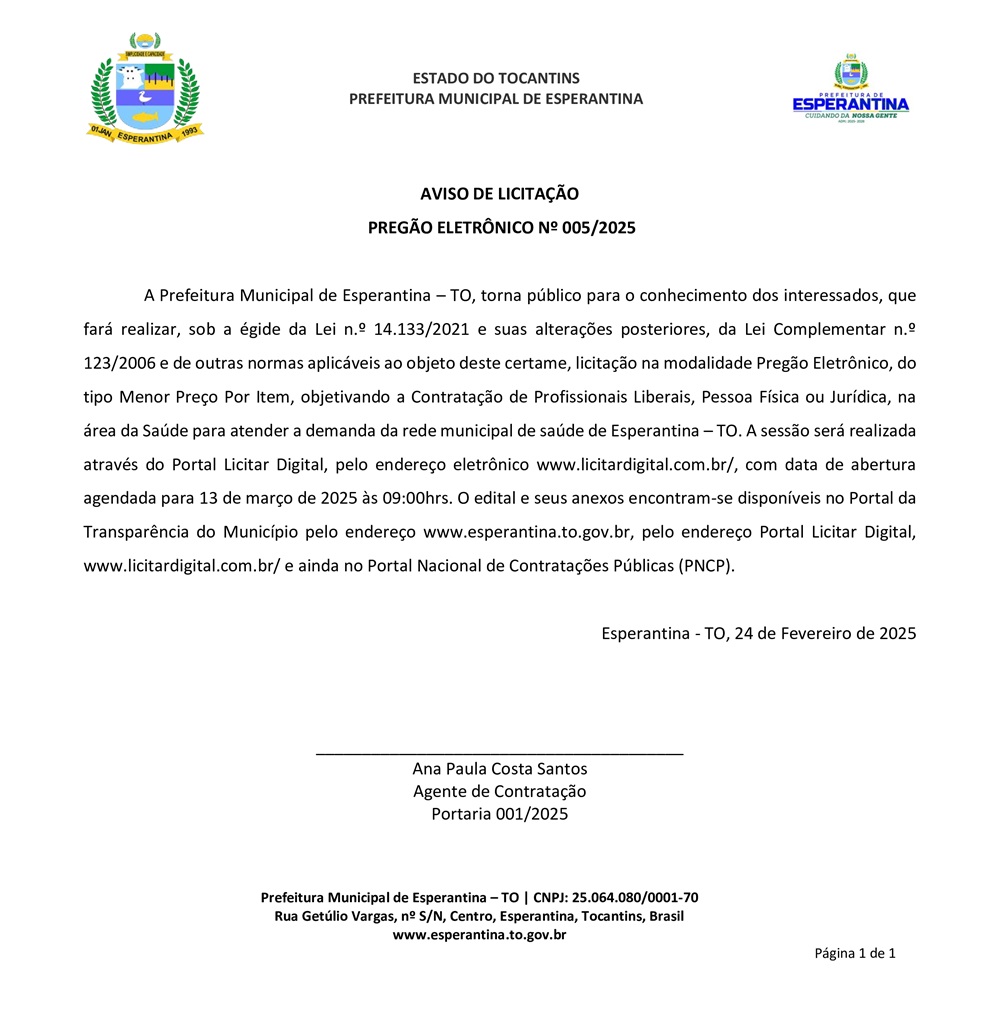 Publicidade Publicidade Geral PREFEITURA DE ESPERANTINA-TO – AVISO DE LICITAÇÃO PREGÃO ELETRÔNICO Nº 005/2025 By Folha do Bico 24 de fevereiro de 2025 0 42 Share WhatsAppPrintTelegramFacebookTwitterCopy URL Folha do Bico Noticias Relacionadas PREFEITURA DE MAURILÂNDIA DO TO – ATO AVISO DE CONCORRÊNCIA ELETRÔNICA Nº 06/2025 – REPUBLICAÇÃO 2 de dezembro de 2025 PREFEITURA DE MAURILÂNDIA DO TO – ATO AVISO DE CONCORRÊNCIA ELETRÔNICA Nº 05/2025 – REPUBLICAÇÃO 2 de dezembro de 2025 PREFEITURA DE MAURILÂNDIA DO TO – ATO AVISO DE CONCORRÊNCIA ELETRÔNICA Nº 04/2025 – REPUBLICAÇÃO 2 de dezembro de 2025 Share WhatsAppPrintTelegramFacebookTwitterCopy URL Previous articleARAGUATINS: Homem de 39 anos morre afogado no Rio AraguaiaNext articleARAGUATINS: Dois jovens são detidos em ação contra o tráfico na Vila Cidinha - Advertisement - - Advertisement - Ultimas noticias AUGUSTINÓPOLIS: Vigilante de abrigo é preso suspeito de abusar duas crianças 4 de dezembro de 2025 SÃO MIGUEL: Lixão é fechado e passa a ter acesso controlado sob novas diretrizes ambientais 4 de dezembro de 2025 ARAGUATINS: Insatisfeitos, Abmael, Chico Moura e Rafael Oliveira passam a votar com a oposição e complicam gestão Aquiles 4 de dezembro de 2025 ARAGUATINS: Com voto decisivo e comando da oposição, Airton se torna principal contraponto à gestão Aquiles 4 de dezembro de 2025