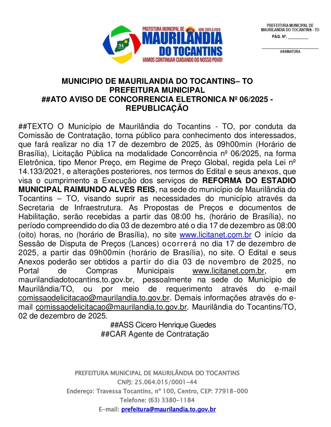 Publicidade Publicidade Geral PREFEITURA DE MAURILÂNDIA DO TO – ATO AVISO DE CONCORRÊNCIA ELETRÔNICA Nº 06/2025 – REPUBLICAÇÃO By Folha do Bico 2 de dezembro de 2025 0 222 Share WhatsAppPrintTelegramFacebookTwitterCopy URL Folha do Bico Noticias Relacionadas PREFEITURA DE MAURILÂNDIA DO TO – ATO AVISO DE CONCORRÊNCIA ELETRÔNICA Nº 05/2025 – REPUBLICAÇÃO 2 de dezembro de 2025 PREFEITURA DE MAURILÂNDIA DO TO – ATO AVISO DE CONCORRÊNCIA ELETRÔNICA Nº 04/2025 – REPUBLICAÇÃO 2 de dezembro de 2025 PREFEITURA DE MAURILÂNDIA DO TO – ATO AVISO DE CONCORRÊNCIA ELETRÔNICA Nº 03/2025 – REPUBLICAÇÃO 2 de dezembro de 2025 Share WhatsAppPrintTelegramFacebookTwitterCopy URL Previous articlePREFEITURA DE MAURILÂNDIA DO TO – ATO AVISO DE CONCORRÊNCIA ELETRÔNICA Nº 05/2025 – REPUBLICAÇÃONext articleTOCANTINÓPOLIS: Assembleia e Prefeitura decretam luto oficial pela morte de José Bonifácio - Advertisement - - Advertisement - Ultimas noticias AUGUSTINÓPOLIS: Vigilante de abrigo é preso suspeito de abusar duas crianças 4 de dezembro de 2025 SÃO MIGUEL: Lixão é fechado e passa a ter acesso controlado sob novas diretrizes ambientais 4 de dezembro de 2025 ARAGUATINS: Insatisfeitos, Abmael, Chico Moura e Rafael Oliveira passam a votar com a oposição e complicam gestão Aquiles 4 de dezembro de 2025 ARAGUATINS: Com voto decisivo e comando da oposição, Airton se torna principal contraponto à gestão Aquiles 4 de dezembro de 2025