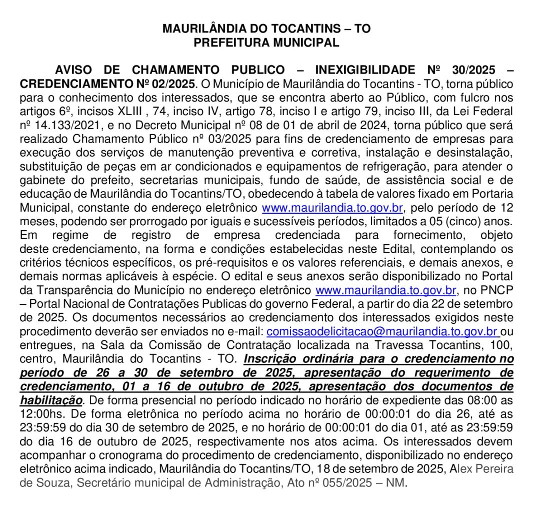 Publicidade Publicidade Geral PREFEITURA DE MAURILÂNDIA DO TO – AVISO DE CHAMAMENTO PÚBLICO – INEXIGIBILIDADE Nº 30/2025 – CREDENCIAMENTO Nº 02/2025 By Folha do Bico 19 de setembro de 2025 0 212 Share WhatsAppPrintTelegramFacebookTwitterCopy URL Folha do Bico Noticias Relacionadas PREFEITURA DE MAURILÂNDIA DO TO – ATO AVISO DE CONCORRÊNCIA ELETRÔNICA Nº 06/2025 – REPUBLICAÇÃO 2 de dezembro de 2025 PREFEITURA DE MAURILÂNDIA DO TO – ATO AVISO DE CONCORRÊNCIA ELETRÔNICA Nº 05/2025 – REPUBLICAÇÃO 2 de dezembro de 2025 PREFEITURA DE MAURILÂNDIA DO TO – ATO AVISO DE CONCORRÊNCIA ELETRÔNICA Nº 04/2025 – REPUBLICAÇÃO 2 de dezembro de 2025 Share WhatsAppPrintTelegramFacebookTwitterCopy URL Previous articleFUNDO MUNICIPAL DE SAÚDE DE MAURILÂNDIA DO TO – AVISO DE CHAMAMENTO PUBLICO – INEXIGIBILIDADE Nº 29/2025 – CREDENCIAMENTO Nº 01/2025Next articleARAGUATINS: Reunião alerta sobre riscos do lixo jogado em terrenos abandonados - Advertisement - - Advertisement - Ultimas noticias AUGUSTINÓPOLIS: Vigilante de abrigo é preso suspeito de abusar duas crianças 4 de dezembro de 2025 SÃO MIGUEL: Lixão é fechado e passa a ter acesso controlado sob novas diretrizes ambientais 4 de dezembro de 2025 ARAGUATINS: Insatisfeitos, Abmael, Chico Moura e Rafael Oliveira passam a votar com a oposição e complicam gestão Aquiles 4 de dezembro de 2025 ARAGUATINS: Com voto decisivo e comando da oposição, Airton se torna principal contraponto à gestão Aquiles 4 de dezembro de 2025