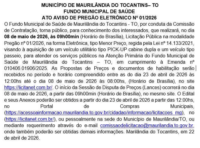 Publicidade Publicidade Geral PREFEITURA DE MAURILÂNDIA DO TO – FUNDO MUNICIPAL DE SAÚDE – ATO AVISO DE PREGÃO ELETRÔNICO Nº 01/2026 By Folha do Bico 22 de abril de 2026 0 115 Share WhatsAppPrintTelegramFacebookTwitterCopy URL Folha do Bico Noticias Relacionadas Hemoglobina glicada: exame indica média da glicose no sangue ao longo dosmeses 22 de abril de 2026 Novas contratações mexem com odds do Tocantinópolis 22 de abril de 2026 OPINIÃO: Coitada de Palmas-TO; casou-se com Brasília, através da BR Belém-Brasília, mas não tem presentes dados pelos parlamentares 13 de abril de 2026 Share WhatsAppPrintTelegramFacebookTwitterCopy URL Previous articleARAGUATINS: Pavimentação da TO-010 é liberada e promete reduzir custos logísticos na regiãoNext articleNovas contratações mexem com odds do Tocantinópolis - Advertisement - - Advertisement - - Advertisement - Ultimas noticias Tocantinópolis é goleado pelo Oratório e cai para lanterna da Série D 22 de abril de 2026 ARAGUATINS: Pavimentação da TO-010 é liberada e promete reduzir custos logísticos na região 22 de abril de 2026 AUGUSTINÓPOLIS: Nova sucuri é capturada em área urbana e acende alerta; Mais de 10 cobras já foram retiradas de residências em 2026 22 de abril de 2026 AUGUSTINÓPOLIS: Considerado um dos idealizadores do câmpus da Unitins, Amélio vai a evento do Governo e mostra força acompanhado de prefeitos, vereadores e líderes 22 de abril de 2026