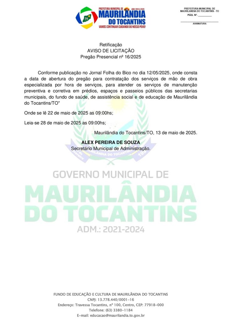 Publicidade Publicidade Geral PREFEITURA DE MAURILÂNDIA DO TO – RETIFICAÇÃO AVISO DE LICITAÇÃO PREGÃO PRESENCIAL nº 16/2025 By Folha do Bico 13 de maio de 2025 0 60 Share WhatsAppPrintTelegramFacebookTwitterCopy URL Folha do Bico Noticias Relacionadas PREFEITURA DE MAURILÂNDIA DO TO – ATO AVISO DE CONCORRÊNCIA ELETRÔNICA Nº 06/2025 – REPUBLICAÇÃO 2 de dezembro de 2025 PREFEITURA DE MAURILÂNDIA DO TO – ATO AVISO DE CONCORRÊNCIA ELETRÔNICA Nº 05/2025 – REPUBLICAÇÃO 2 de dezembro de 2025 PREFEITURA DE MAURILÂNDIA DO TO – ATO AVISO DE CONCORRÊNCIA ELETRÔNICA Nº 04/2025 – REPUBLICAÇÃO 2 de dezembro de 2025 Share WhatsAppPrintTelegramFacebookTwitterCopy URL Previous articlePesquisa inédita sobre mídia no Bico do Papagaio garante título de doutor a jornalista biquenseNext articleFAET/Senar aposta em tecnologia, gestão e formação para impulsionar o agro na Agrotins 2025 - Advertisement - - Advertisement - Ultimas noticias AUGUSTINÓPOLIS: Vigilante de abrigo é preso suspeito de abusar duas crianças 4 de dezembro de 2025 SÃO MIGUEL: Lixão é fechado e passa a ter acesso controlado sob novas diretrizes ambientais 4 de dezembro de 2025 ARAGUATINS: Insatisfeitos, Abmael, Chico Moura e Rafael Oliveira passam a votar com a oposição e complicam gestão Aquiles 4 de dezembro de 2025 ARAGUATINS: Com voto decisivo e comando da oposição, Airton se torna principal contraponto à gestão Aquiles 4 de dezembro de 2025