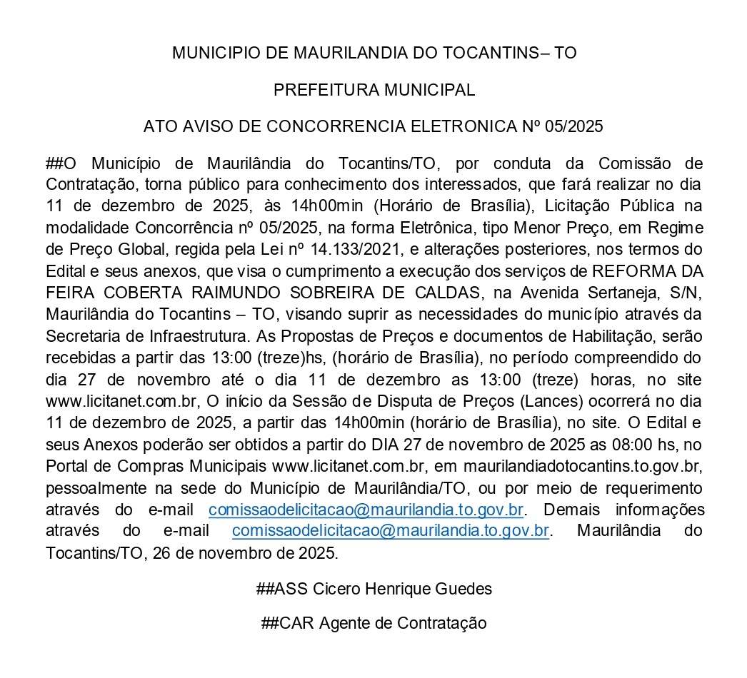 Publicidade Publicidade Geral PREFEITURA DE MAURILÂNDIA-TO – ATO AVISO DE CONCORRÊNCIA ELETRÔNICA Nº 05/2025 By Folha do Bico 26 de novembro de 2025 0 423 Share WhatsAppPrintTelegramFacebookTwitterCopy URL Folha do Bico Noticias Relacionadas PREFEITURA DE MAURILÂNDIA DO TO – ATO AVISO DE CONCORRÊNCIA ELETRÔNICA Nº 06/2025 – REPUBLICAÇÃO 2 de dezembro de 2025 PREFEITURA DE MAURILÂNDIA DO TO – ATO AVISO DE CONCORRÊNCIA ELETRÔNICA Nº 05/2025 – REPUBLICAÇÃO 2 de dezembro de 2025 PREFEITURA DE MAURILÂNDIA DO TO – ATO AVISO DE CONCORRÊNCIA ELETRÔNICA Nº 04/2025 – REPUBLICAÇÃO 2 de dezembro de 2025 Share WhatsAppPrintTelegramFacebookTwitterCopy URL Previous articleTOCANTINÓPOLIS: Fiscalização expõe que melhorias na UPA só avançaram após pressão do TCENext articleArticulação de Vicentinho Júnior leva R$ 9 milhões em centros esportivos para o Bico - Advertisement - - Advertisement - Ultimas noticias AUGUSTINÓPOLIS: Vigilante de abrigo é preso suspeito de abusar duas crianças 4 de dezembro de 2025 SÃO MIGUEL: Lixão é fechado e passa a ter acesso controlado sob novas diretrizes ambientais 4 de dezembro de 2025 ARAGUATINS: Insatisfeitos, Abmael, Chico Moura e Rafael Oliveira passam a votar com a oposição e complicam gestão Aquiles 4 de dezembro de 2025 ARAGUATINS: Com voto decisivo e comando da oposição, Airton se torna principal contraponto à gestão Aquiles 4 de dezembro de 2025