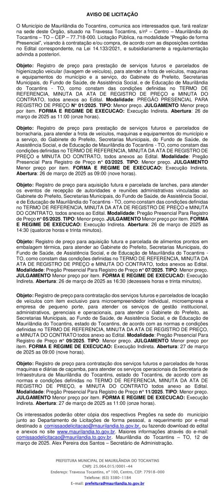 Publicidade Publicidade Geral PREFEITURA DE MAURILÂNDIA-TO – AVISO DE LICITAÇÃO By Folha do Bico 13 de março de 2025 0 162 Share WhatsAppPrintTelegramFacebookTwitterCopy URL Folha do Bico Noticias Relacionadas PREFEITURA DE MAURILÂNDIA DO TO – ATO AVISO DE CONCORRÊNCIA ELETRÔNICA Nº 06/2025 – REPUBLICAÇÃO 2 de dezembro de 2025 PREFEITURA DE MAURILÂNDIA DO TO – ATO AVISO DE CONCORRÊNCIA ELETRÔNICA Nº 05/2025 – REPUBLICAÇÃO 2 de dezembro de 2025 PREFEITURA DE MAURILÂNDIA DO TO – ATO AVISO DE CONCORRÊNCIA ELETRÔNICA Nº 04/2025 – REPUBLICAÇÃO 2 de dezembro de 2025 Share WhatsAppPrintTelegramFacebookTwitterCopy URL Previous articlePREFEITURA DE MAURILÂNDIA-TO – ATO AVISO DE CONCORRÊNCIA ELETRÔNICA Nº 01/2025Next articleMUNICÍPIO DE MAURILÂNDIA-TO – FUNDO MUNICIPAL DE ASSISTÊNCIA SOCIAL – AVISO DE PREGÃO ELETRÔNICO Nº 02/2025 - Advertisement - - Advertisement - Ultimas noticias AUGUSTINÓPOLIS: Vigilante de abrigo é preso suspeito de abusar duas crianças 4 de dezembro de 2025 SÃO MIGUEL: Lixão é fechado e passa a ter acesso controlado sob novas diretrizes ambientais 4 de dezembro de 2025 ARAGUATINS: Insatisfeitos, Abmael, Chico Moura e Rafael Oliveira passam a votar com a oposição e complicam gestão Aquiles 4 de dezembro de 2025 ARAGUATINS: Com voto decisivo e comando da oposição, Airton se torna principal contraponto à gestão Aquiles 4 de dezembro de 2025