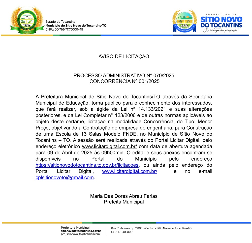 Publicidade Publicidade Geral PREFEITURA DE SÍTIO NOVO DO TO – AVISO DE LICITAÇÃO – PROCESSO ADMINISTRATIVO Nº 070/2025 – CONCORRÊNCIA Nº 001/2025 By Folha do Bico 24 de março de 2025 0 49 Share WhatsAppPrintTelegramFacebookTwitterCopy URL Folha do Bico Noticias Relacionadas PREFEITURA DE MAURILÂNDIA DO TO – ATO AVISO DE CONCORRÊNCIA ELETRÔNICA Nº 06/2025 – REPUBLICAÇÃO 2 de dezembro de 2025 PREFEITURA DE MAURILÂNDIA DO TO – ATO AVISO DE CONCORRÊNCIA ELETRÔNICA Nº 05/2025 – REPUBLICAÇÃO 2 de dezembro de 2025 PREFEITURA DE MAURILÂNDIA DO TO – ATO AVISO DE CONCORRÊNCIA ELETRÔNICA Nº 04/2025 – REPUBLICAÇÃO 2 de dezembro de 2025 Share WhatsAppPrintTelegramFacebookTwitterCopy URL Previous articleAraguaína goleia Capital em Palmas e garante vaga na final, Série D e Copa do Brasil 2026Next articleWemerson Lima é eleito presidente do CELGBTQIA+ - Advertisement - - Advertisement - Ultimas noticias AUGUSTINÓPOLIS: Vigilante de abrigo é preso suspeito de abusar duas crianças 4 de dezembro de 2025 SÃO MIGUEL: Lixão é fechado e passa a ter acesso controlado sob novas diretrizes ambientais 4 de dezembro de 2025 ARAGUATINS: Insatisfeitos, Abmael, Chico Moura e Rafael Oliveira passam a votar com a oposição e complicam gestão Aquiles 4 de dezembro de 2025 ARAGUATINS: Com voto decisivo e comando da oposição, Airton se torna principal contraponto à gestão Aquiles 4 de dezembro de 2025
