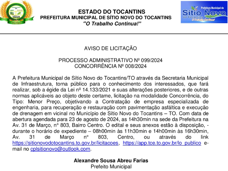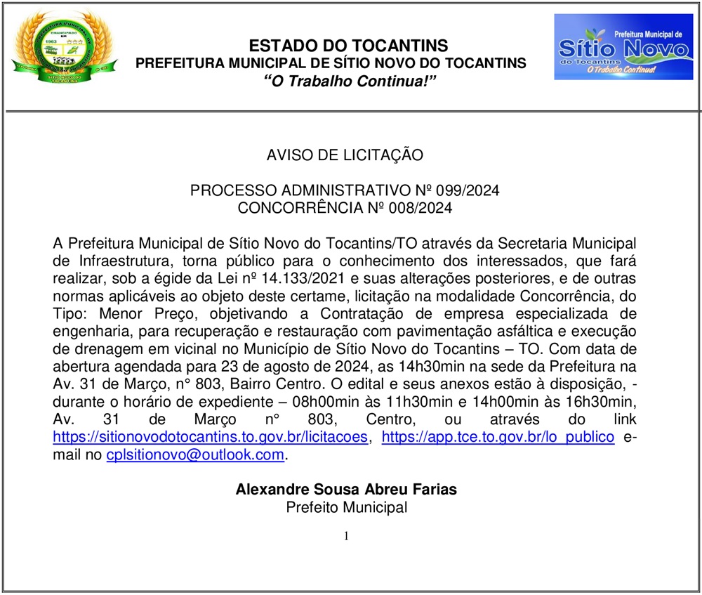 Publicidade Publicidade Geral PREFEITURA DE SÍTIO NOVO DO TO – AVISO DE LICITAÇÃO – PROCESSO ADMINISTRATIVO Nº 099/2024 – CONCORRÊNCIA Nº 008/2024 By Folha do Bico 8 de agosto de 2024 0 141 Share WhatsAppPrintTelegramFacebookTwitterCopy URL Folha do Bico Noticias Relacionadas PREFEITURA DE MAURILÂNDIA DO TO – ATO AVISO DE CONCORRÊNCIA ELETRÔNICA Nº 06/2025 – REPUBLICAÇÃO 2 de dezembro de 2025 PREFEITURA DE MAURILÂNDIA DO TO – ATO AVISO DE CONCORRÊNCIA ELETRÔNICA Nº 05/2025 – REPUBLICAÇÃO 2 de dezembro de 2025 PREFEITURA DE MAURILÂNDIA DO TO – ATO AVISO DE CONCORRÊNCIA ELETRÔNICA Nº 04/2025 – REPUBLICAÇÃO 2 de dezembro de 2025 Share WhatsAppPrintTelegramFacebookTwitterCopy URL Previous articleProfessora no Maranhão utiliza dados de colegas para estelionato e lavagem de dinheiroNext articleARAGUATINS: Veja as vagas de emprego no SINE para esta quinta, 8 - Advertisement - - Advertisement - Ultimas noticias AUGUSTINÓPOLIS: Acender das Luzes celebra 4ª edição da Magia do Natal com espetáculo especial nesta sexta-feira 5 de dezembro de 2025 AUGUSTINÓPOLIS: Comunidade celebra a chegada do período natalino com cores, música e emoção 5 de dezembro de 2025 AUGUSTINÓPOLIS: Vigilante de abrigo é preso suspeito de abusar duas crianças 4 de dezembro de 2025 SÃO MIGUEL: Lixão é fechado e passa a ter acesso controlado sob novas diretrizes ambientais 4 de dezembro de 2025