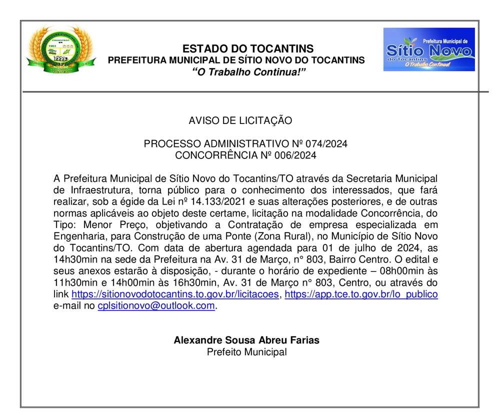 Publicidade Publicidade Geral PREFEITURA DE SÍTIO NOVO DO TOCANTINS – AVISO DE LICITAÇÃO PROCESSO ADMINISTRATIVO Nº 074/2024 By Folha do Bico 14 de junho de 2024 0 92 Share WhatsAppPrintTelegramFacebookTwitterCopy URL Folha do Bico Noticias Relacionadas Recorte Automático de Vídeo para uma Edição Multiformato Sem Esforço 5 de dezembro de 2025 PREFEITURA DE MAURILÂNDIA DO TO – ATO AVISO DE CONCORRÊNCIA ELETRÔNICA Nº 06/2025 – REPUBLICAÇÃO 2 de dezembro de 2025 PREFEITURA DE MAURILÂNDIA DO TO – ATO AVISO DE CONCORRÊNCIA ELETRÔNICA Nº 05/2025 – REPUBLICAÇÃO 2 de dezembro de 2025 Share WhatsAppPrintTelegramFacebookTwitterCopy URL Previous articleSÃO SEBASTIÃO: Prefeito Adriano anuncia investimento de R$ 3,6 milhões em pavimentação urbanaNext articleLUÍS EDUARDO MAGALHÃES: Governador Jerônimo Rodrigues destaca importância da Bahia Farm Show - Advertisement - - Advertisement - Ultimas noticias STF derruba afastamento de Wanderlei Barbosa e governador reassume mandato 5 de dezembro de 2025 AUGUSTINÓPOLIS: Acender das Luzes celebra 4ª edição da Magia do Natal com espetáculo especial nesta sexta-feira 5 de dezembro de 2025 44 mil famílias sem casa. Enquanto isso, a política do Tocantins segue repetindo promessas que nunca saem do papel 5 de dezembro de 2025 AUGUSTINÓPOLIS: Comunidade celebra a chegada do período natalino com cores, música e emoção 5 de dezembro de 2025