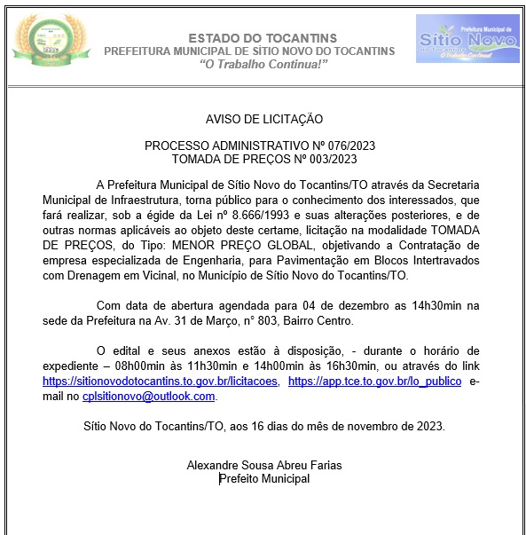 Publicidade Publicidade Geral PREFEITURA SÍTIO NOVO DO TOCANTINS – AVISO DE LICITAÇÃO By Folha do Bico 16 de novembro de 2023 0 159 Share WhatsAppPrintTelegramFacebookTwitterCopy URL Folha do Bico Noticias Relacionadas Recorte Automático de Vídeo para uma Edição Multiformato Sem Esforço 5 de dezembro de 2025 PREFEITURA DE MAURILÂNDIA DO TO – ATO AVISO DE CONCORRÊNCIA ELETRÔNICA Nº 06/2025 – REPUBLICAÇÃO 2 de dezembro de 2025 PREFEITURA DE MAURILÂNDIA DO TO – ATO AVISO DE CONCORRÊNCIA ELETRÔNICA Nº 05/2025 – REPUBLICAÇÃO 2 de dezembro de 2025 Share WhatsAppPrintTelegramFacebookTwitterCopy URL Previous articleAUGUSTINÓPOLIS: Ex-gerente de supermercado é preso, acusado de desviar quase meio milhãoNext articlePolícia Militar recebe moção de aplausos da Associação dos Produtores do Bico do Papagaio - Advertisement - - Advertisement - Ultimas noticias STF derruba afastamento de Wanderlei Barbosa e governador reassume mandato 5 de dezembro de 2025 AUGUSTINÓPOLIS: Acender das Luzes celebra 4ª edição da Magia do Natal com espetáculo especial nesta sexta-feira 5 de dezembro de 2025 44 mil famílias sem casa. Enquanto isso, a política do Tocantins segue repetindo promessas que nunca saem do papel 5 de dezembro de 2025 AUGUSTINÓPOLIS: Comunidade celebra a chegada do período natalino com cores, música e emoção 5 de dezembro de 2025
