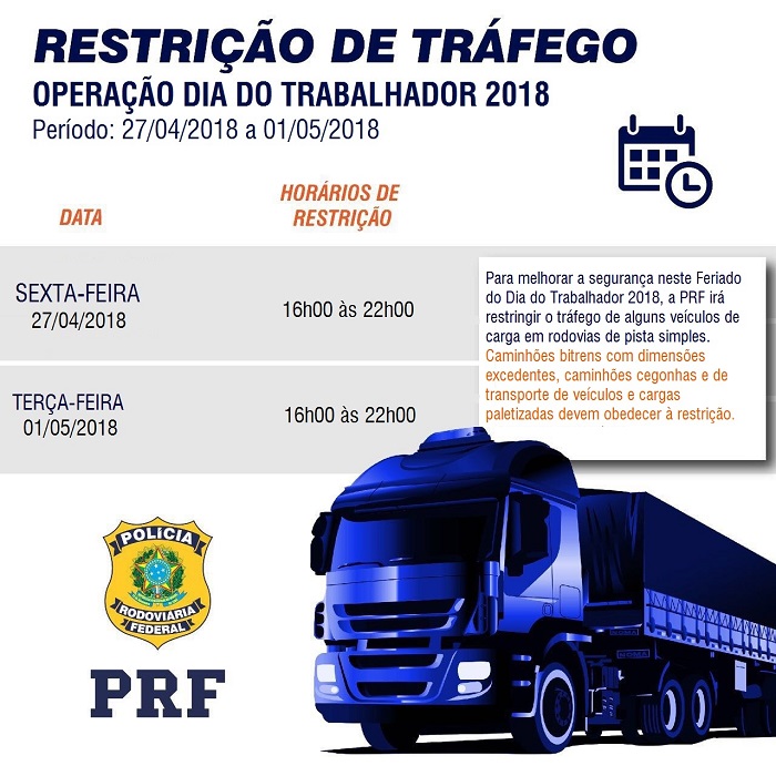 A Polícia Rodoviária Federal (PRF) começa nesta sexta-feira (27) a Operação Dia do Trabalhador com foco nas fiscalizações de excesso de velocidade, embriaguez ao volante e ultrapassagens irregulares. Com reforço no efetivo, a ação iniciou nas 0h desta sexta-feira até às 23h59 do dia 01 de maio. Durante os cinco dias, policiais rodoviários federais reforçarão a fiscalização nos trechos com maiores índices de acidentes e crimes, de acordo com estatísticas do órgão.
