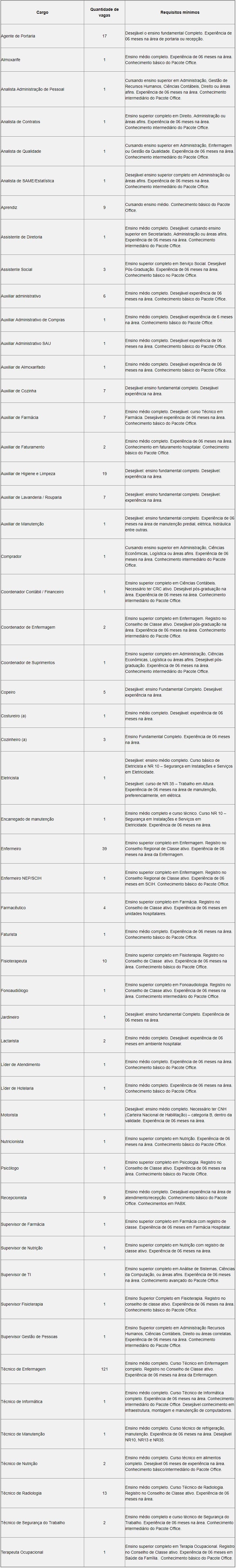 A Pró-Saúde Associação Beneficente de Assistência Social e Hospitalar abriu 322 vagas, em diversas áreas, para contratar a equipe que vai trabalhar no Hospital Materno Infantil, em Barcarena. Todos os cargos possuem disponibilidade para pessoas com deficiência (PCD), observando-se, obrigatoriamente, os critérios descritos em edital, conforme legislação vigente.