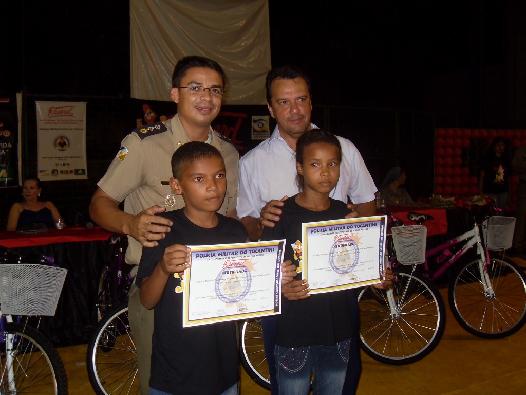 Durante solenidade receberam o certificado de conclusão do curso PROERD 396 alunos de oito escolas das redes Municipal, Estadual e Particular de Ensino, dos quais 08 ganharam uma bicicleta cada, como premiação por terem tido suas redações classificadas as melhores entre as produzidas em sala de aula, como parte das atividades dos três meses de curso.