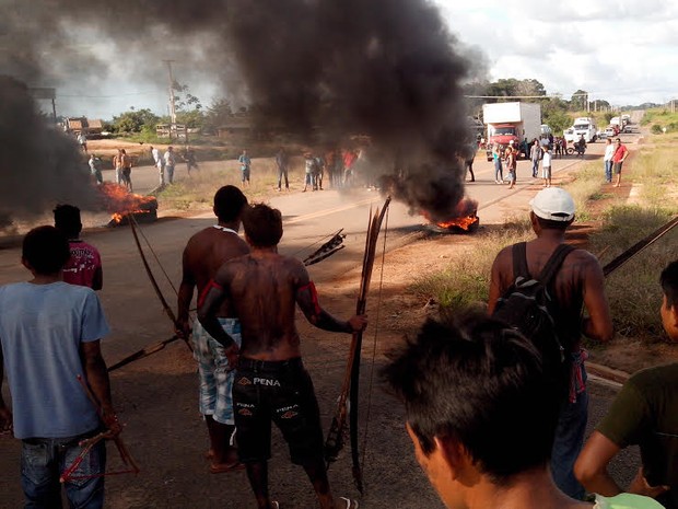 Na rodovia, pneus e paus foram incendiados para bloquear a passagem de veículos, que foram revistados pelos manifestantes durante toda a tarde desta terça. O transporte de operários e mantimentos para os canteiros de obras foi impedido, e dois ônibus que tentaram furar o bloqueio receberam flechadas.