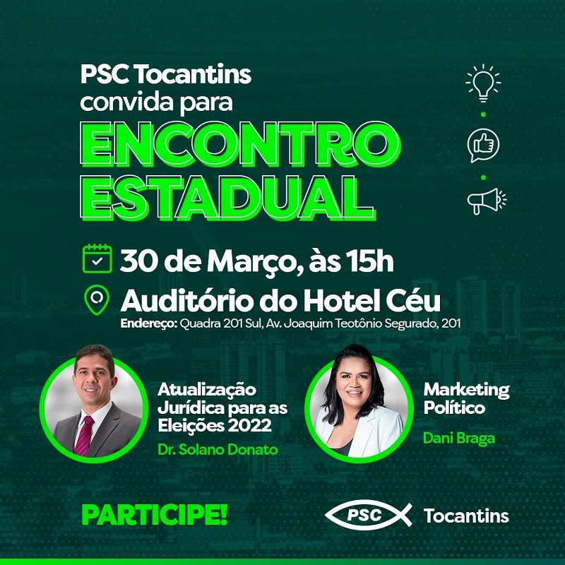 No próximo dia 30, o Partido Social Cristão (PSC) promoverá um evento de filiação de pré-candidatos a deputado estadual e duas palestras voltadas para as eleições de 2022. O evento será a partir das 15h, no Hotel Céu, em Palmas.