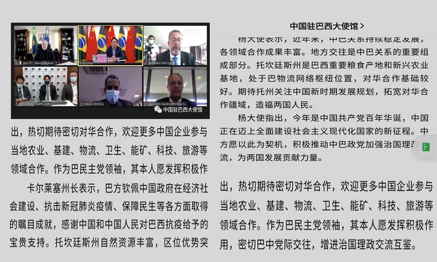 A audiência on-line entre o governador do Estado do Tocantins, Mauro Carlesse; e o embaixador chinês no Brasil, Yang Wanming, com objetivos de fortalecer relações comerciais com a China e prospectar parceiros para empresários tocantinenses foi destaque em veículos de comunicação daquele país. A reunião ocorreu na última terça-feira, 23.