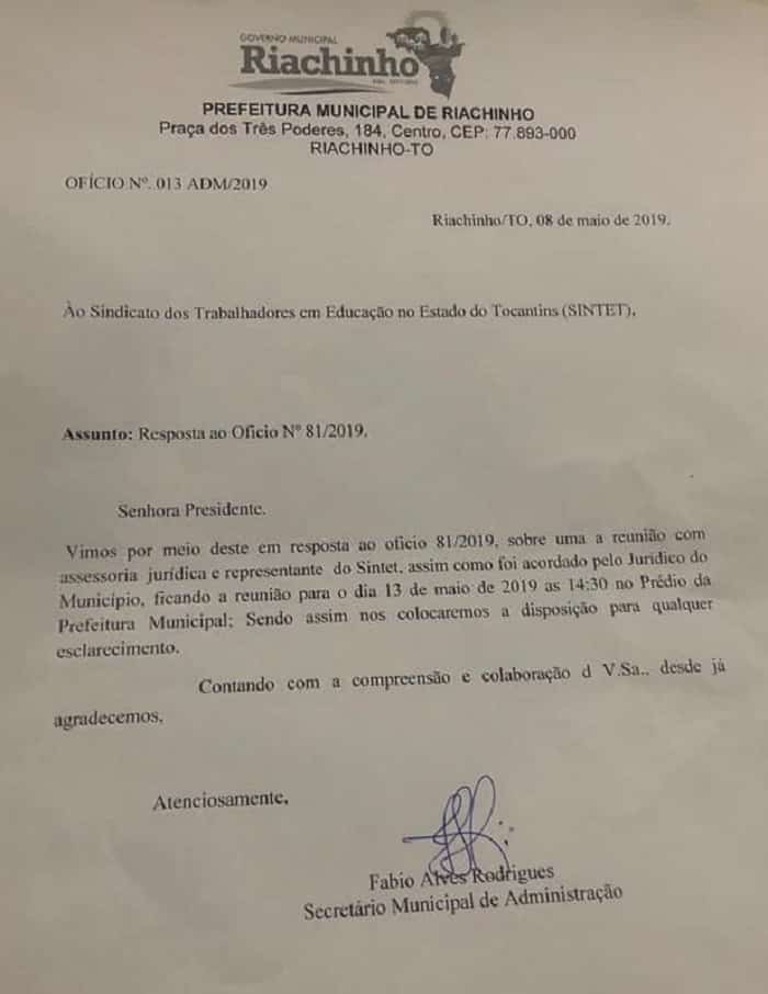 Os profissionais da rede municipal de Educação de Riachinho anunciaram, a suspensão da greve da categoria, após trinta dias sem aulas. A suspensão do movimento paredista faz parte de um acordo oficializado entre assessoria jurídica do Município e do Sindicato dos Trabalhadores em Educação no Estado do Tocantins (Sintet).