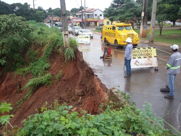 A chuva que alagou parte da cidade de Araguaína, no norte do Tocantins, na manhã desta terça-feira (24) também causou um novo deslizamento na TO-222, que fica em uma das estradas da cidade. Desde janeiro de 2016 há uma cratera aberta na rodovia. A barreira de pedras que fazia a contenção não resistiu e foi levada pela erosão, o buraco voltou a atingir a pista. Um poste que está no local ameaça cair.