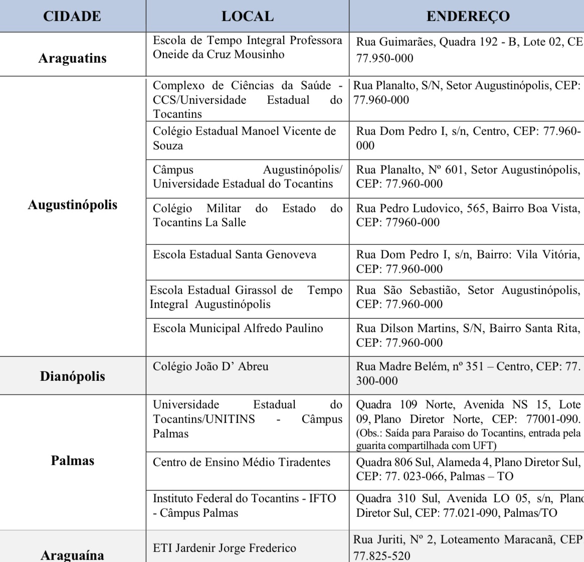Os inscritos no Vestibular 2024/1 da Universidade Estadual do Tocantins (Unitins) já podem acessar o Portal da instituição e conferir o endereço completo dos locais de aplicação das provas (acesse aqui) que serão aplicadas no próximo domingo, 03 de dezembro, a partir das 8h.