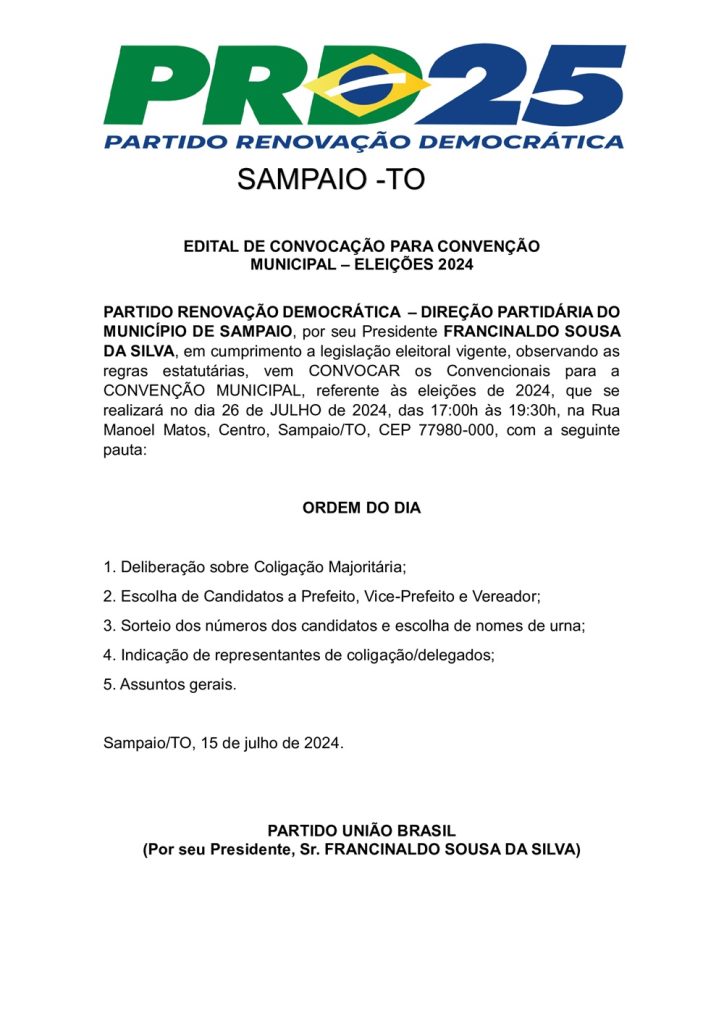 Publicidade Publicidade Geral SAMPAIO – EDITAL CONVOCAÇÃO DE CONVENÇÃO PARTIDÁRIA – PRD By Folha do Bico 17 de julho de 2024 0 114 Share WhatsAppPrintTelegramFacebookTwitterCopy URL Folha do Bico Noticias Relacionadas Recorte Automático de Vídeo para uma Edição Multiformato Sem Esforço 5 de dezembro de 2025 PREFEITURA DE MAURILÂNDIA DO TO – ATO AVISO DE CONCORRÊNCIA ELETRÔNICA Nº 06/2025 – REPUBLICAÇÃO 2 de dezembro de 2025 PREFEITURA DE MAURILÂNDIA DO TO – ATO AVISO DE CONCORRÊNCIA ELETRÔNICA Nº 05/2025 – REPUBLICAÇÃO 2 de dezembro de 2025 Share WhatsAppPrintTelegramFacebookTwitterCopy URL Previous articleSAMPAIO – EDITAL CONVOCAÇÃO DE CONVENÇÃO PARTIDÁRIA – PODEMOSNext articleSAMPAIO – EDITAL CONVOCAÇÃO DE CONVENÇÃO PARTIDÁRIA – REDE - Advertisement - - Advertisement - Ultimas noticias STF derruba afastamento de Wanderlei Barbosa e governador reassume mandato 5 de dezembro de 2025 AUGUSTINÓPOLIS: Acender das Luzes celebra 4ª edição da Magia do Natal com espetáculo especial nesta sexta-feira 5 de dezembro de 2025 44 mil famílias sem casa. Enquanto isso, a política do Tocantins segue repetindo promessas que nunca saem do papel 5 de dezembro de 2025 AUGUSTINÓPOLIS: Comunidade celebra a chegada do período natalino com cores, música e emoção 5 de dezembro de 2025