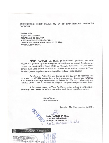 Maria de Lourdes havia recorrido da decisão que indeferiu sua candidatura, mas no domingom 15, apresentou o pedido de renúncia tanto ao Juízo da 21ª Zona Eleitoral quanto ao Tribunal Regional Eleitoral do Tocantins (TRE-TO). Com base no Código de Processo Civil (art. 998), a desistência foi homologada pelo relator do processo, conforme previsto no Regimento Interno do TRE-TO.