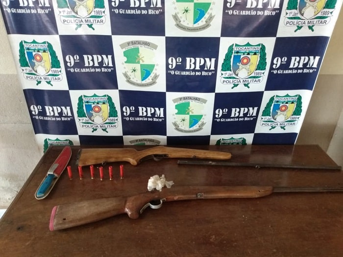 Em poder do idoso os policiais apreenderam duas espingardas; uma de fabricação artesanal e outra de calibre 36 com seis cartuchos intactos do mesmo calibre e ainda uma faca. Os objetos estavam guardados na casa do suspeito. A PM adentrou ao imóvel com a autorização do dono da casa.