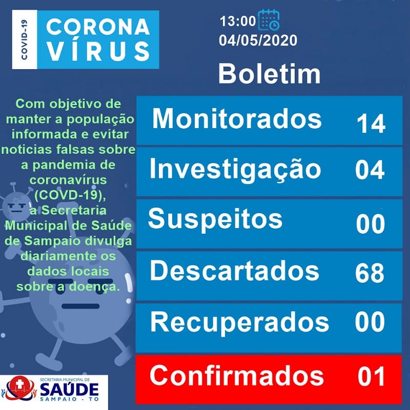 O município de Sampaio confirmou nesta segunda, 4, o primeiro caso de coronavírus (Covid-19). O paciente é um homem de 33 anos que não faz parte dos grupos de risco para a doença.