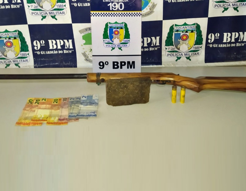 A Polícia Militar (PM), apreendeu na tarde de sábado, 26, cerca de 319 gramas de substâncias análogas à maconha, uma espingarda calibre 28, com dois cartuchos intactos do mesmo calibre e R$96,00 em espécie, em poder de um homem de 40 anos. O suspeito acabou preso por tráfico de drogas e posse ilegal de arma de fogo. A ocorrência se deu em um assentamento denominado de Bacuri, distrito de Sampaio, no Bico do Papagaio.