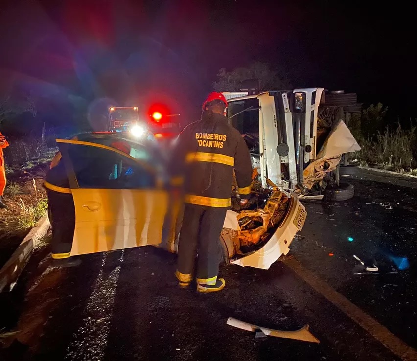 Os bombeiros informaram que foram chamados por volta das 19h. Quando chegaram ao local os militares encontraram uma carreta fora da pista, um caminhão baú tombado no meio da rodovia após bater de frente com o carro de passeio, que ficou destruído.