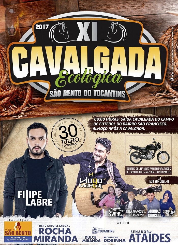 A XI Cavalgada Ecológica de São Bento é promovida pela Prefeitura Municipal de São Bento, com o apoio do Governo do Estado do Tocantins, Câmara Municipal, deputado estadual Rocha Miranda, deputada federal Dulce Miranda, deputa federal Professora Dorinha e senador Ataídes.
