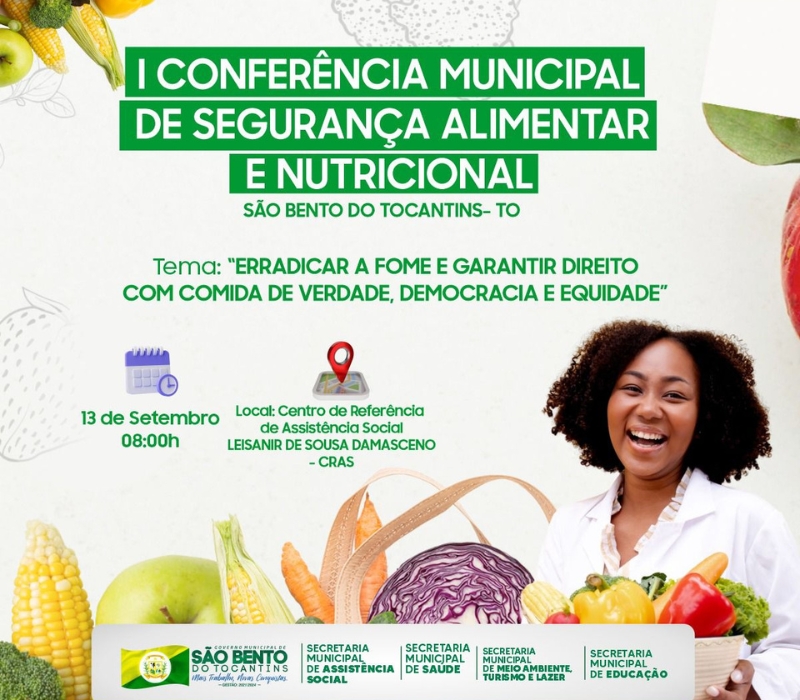 Acontecerá no dia 13 de setembro, às 8h, no Centro de Referência de Assistência Social (CRAS) Leisanir de Sousa Damasceno, em São Bento, no Bico do Papagaio, a I Conferência Municipal de Segurança Alimentar e Nutricional.