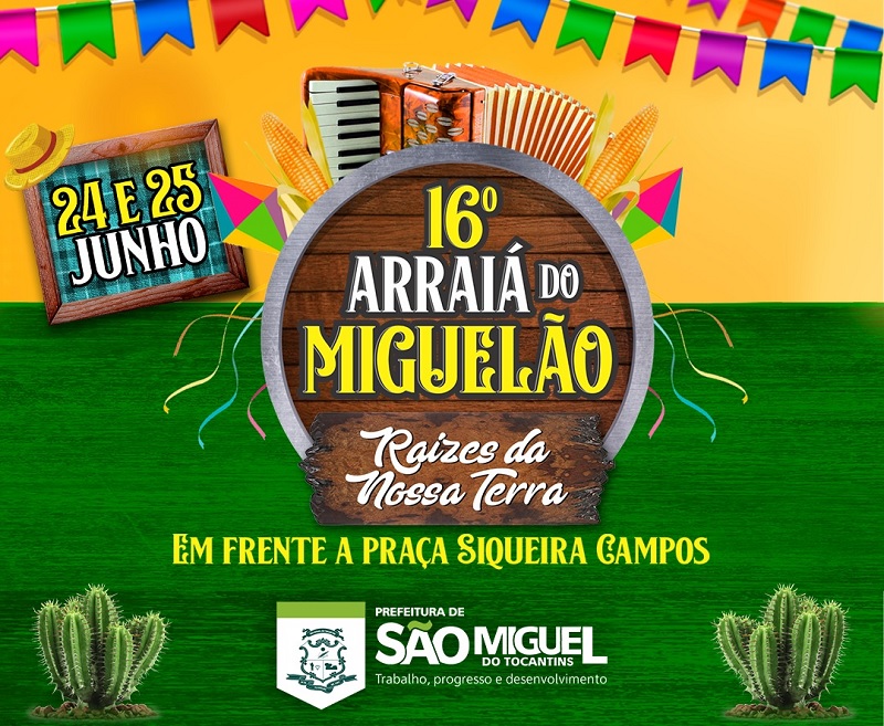 A prefeitura de São Miguel, no Bico do Papagaio, realizará nos dias 24 e 25 de junho o 16ª Arraiá do Miguelão com o tema “Raízes da Nossa Terra”. A festa acontecerá em frente à praça Siqueira Campos, no centro do município a partir das 19h.